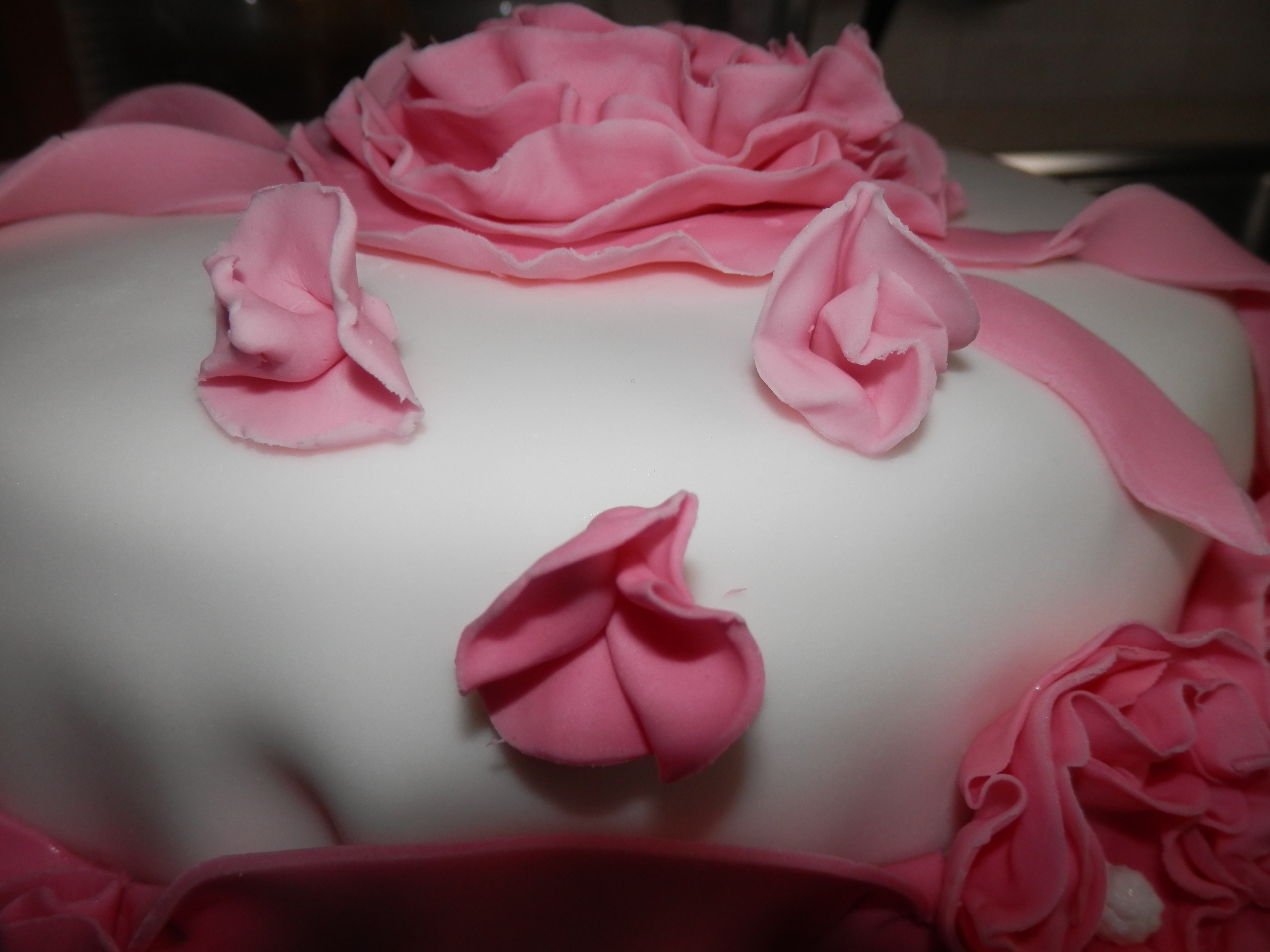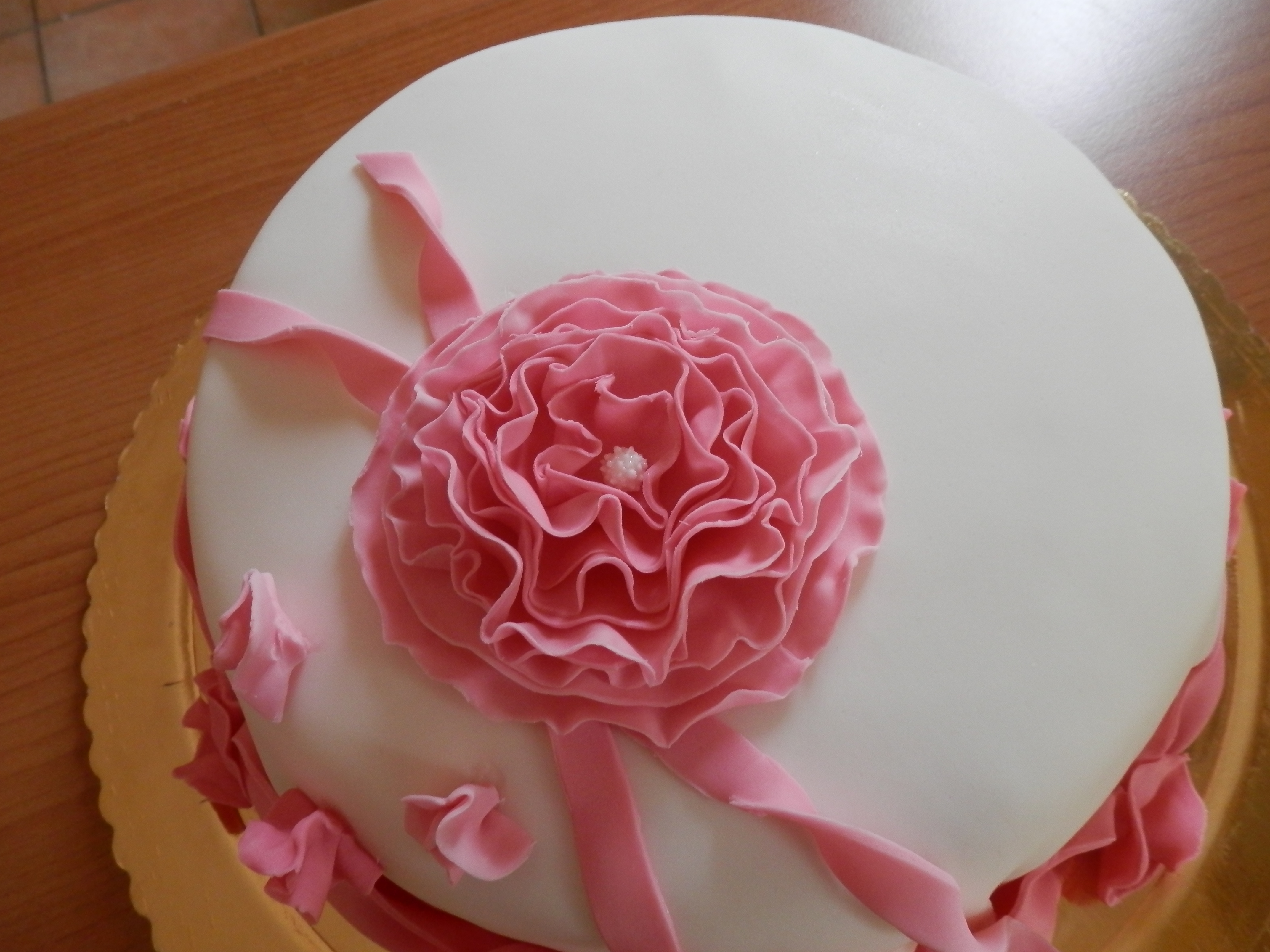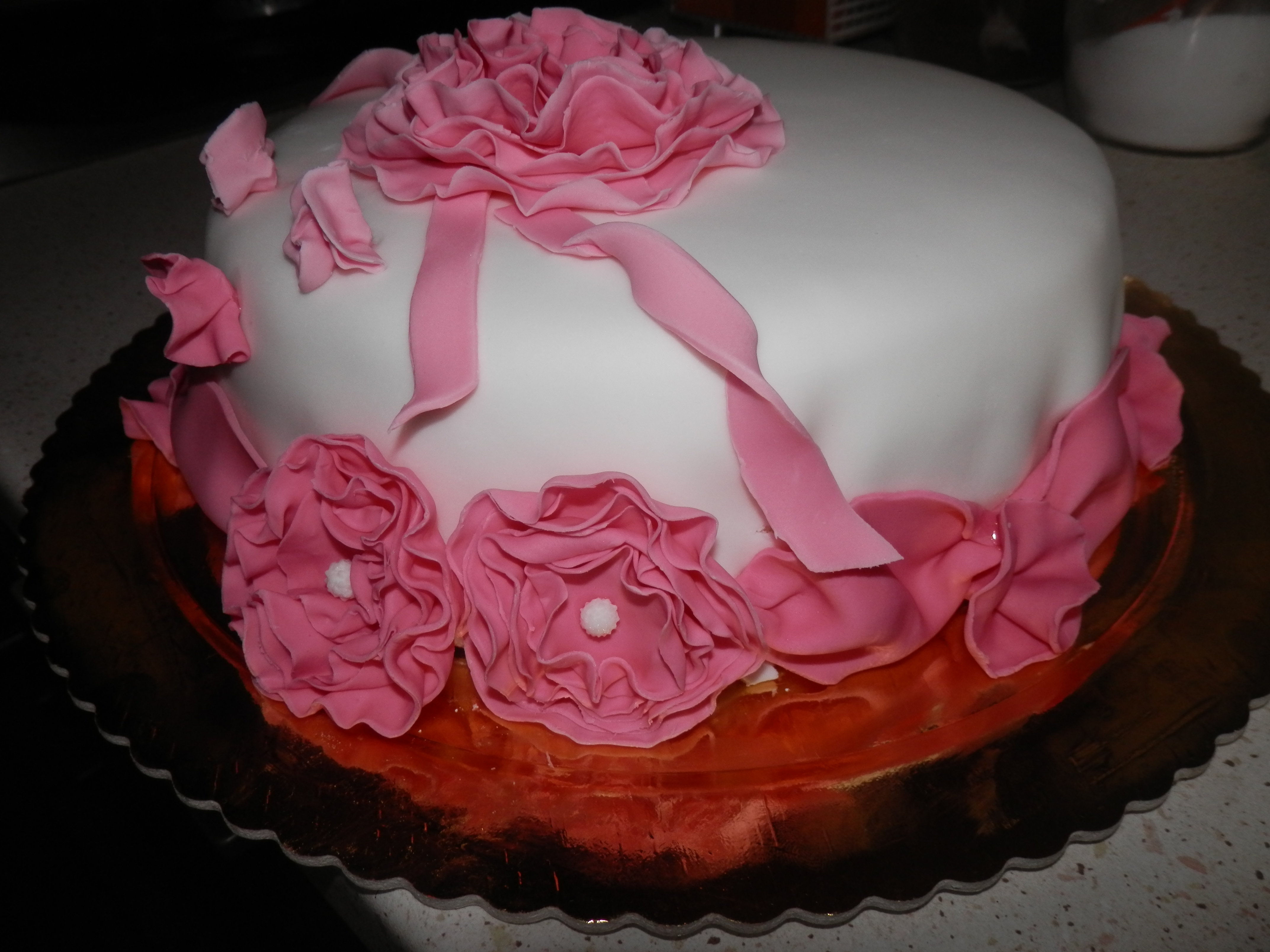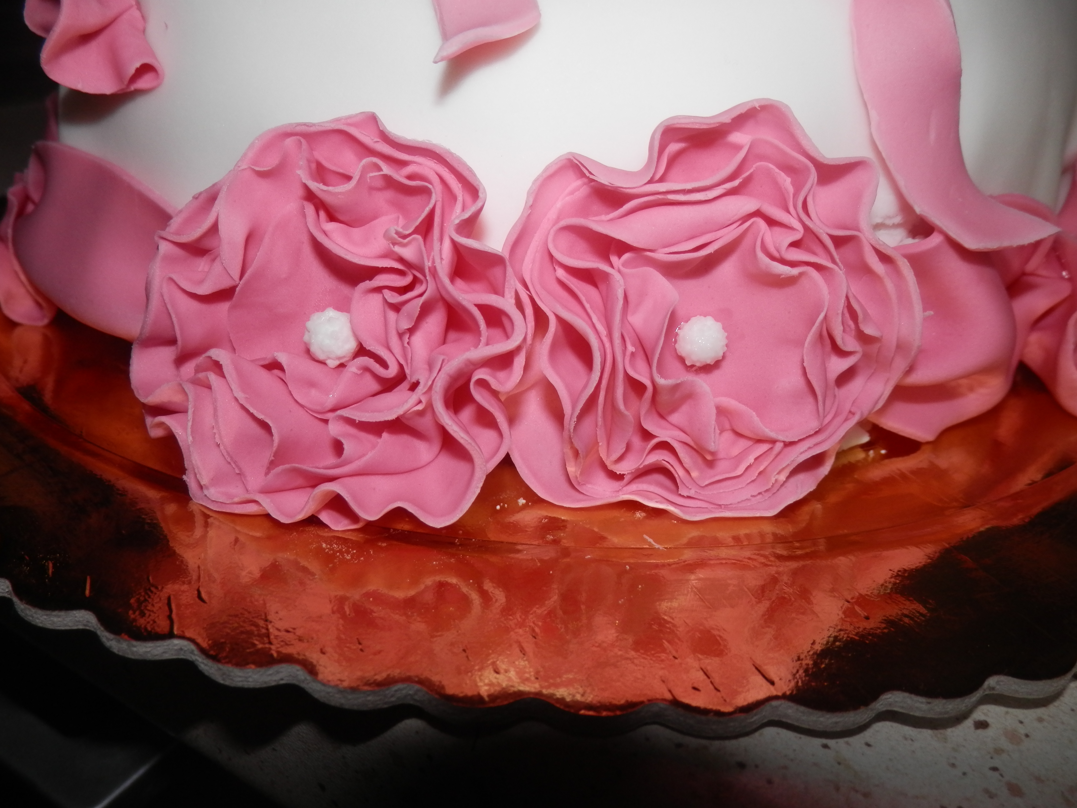 Sempre il venerdì sera, ho preparato i fiori (ruffle flowers) in pasta di zucchero, in modo tale che si potessero asciugare. la preparazione è molto semplice: io ho seguito un tutorial di cui vi riporto il link http://cake.corriere.it/2013/07/10/una-dolce-tenerezza-tutorial-per-realizzare-un-ruffle-flower/. Sabato mattina, l’ho rivestita con la pasta di zucchero e l’ho decorata.