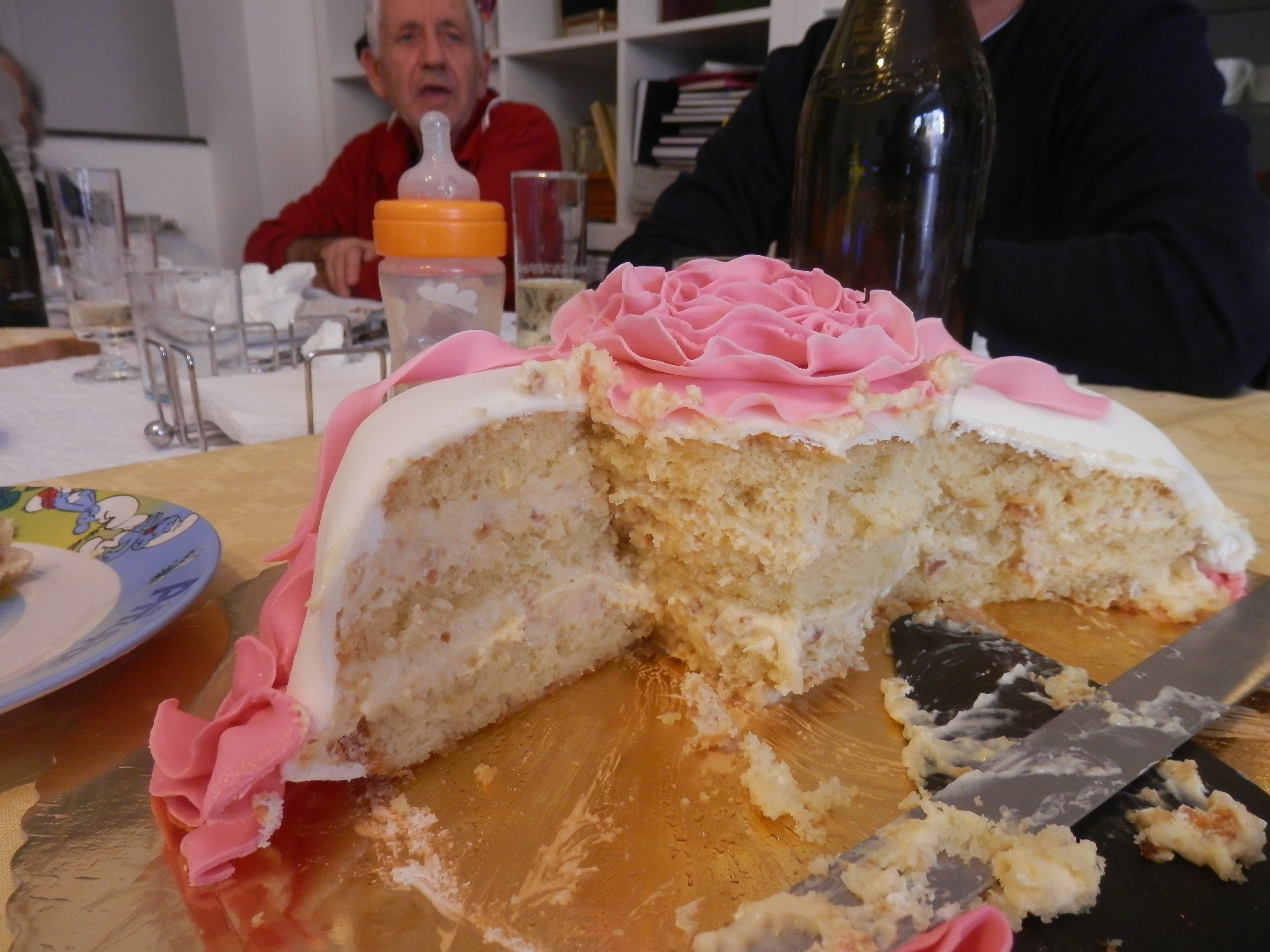 Per l’assemblaggio della torta, tagliare il pan di Spagna in tre strati, bagnare il primo strato, versare parte della crema, coprire con il secondo strato, bagnarlo, versare la restante crema (in realtà, non l’ho usata tutta, altrimenti gli strati di farcitura sarebbero stati troppo alti e non so se la torta sarebbe arrivata a destinazione: infatti ha dovuto viaggiare per un po’ di Km) e coprire con l’ultimo strato di pan di Spagna. Dopo alcune ore di riposo in frigo, stuccarla con la panna montata e rimetterla in frigorifero: questo lavoro l’ho fatto il venerdì.