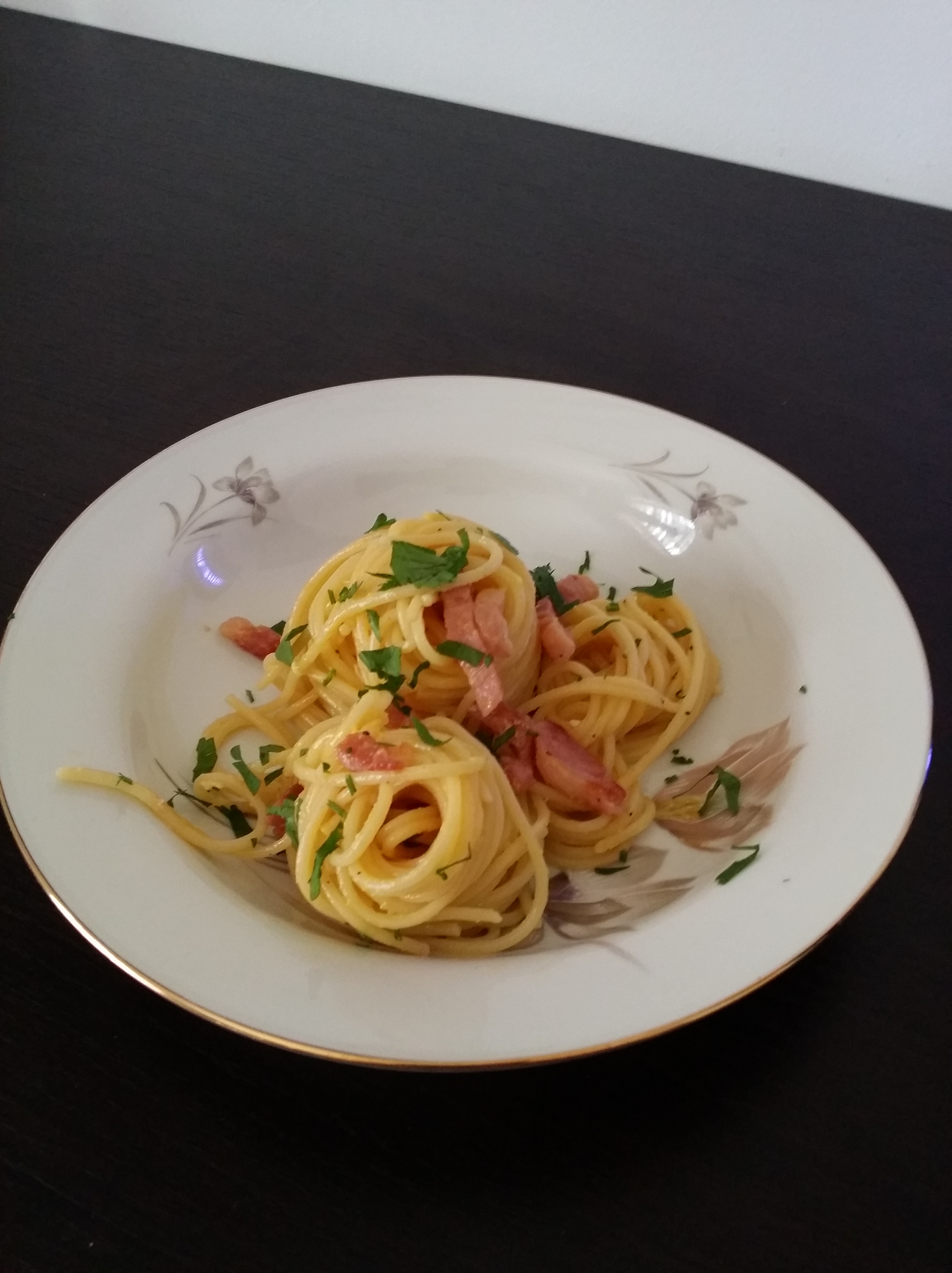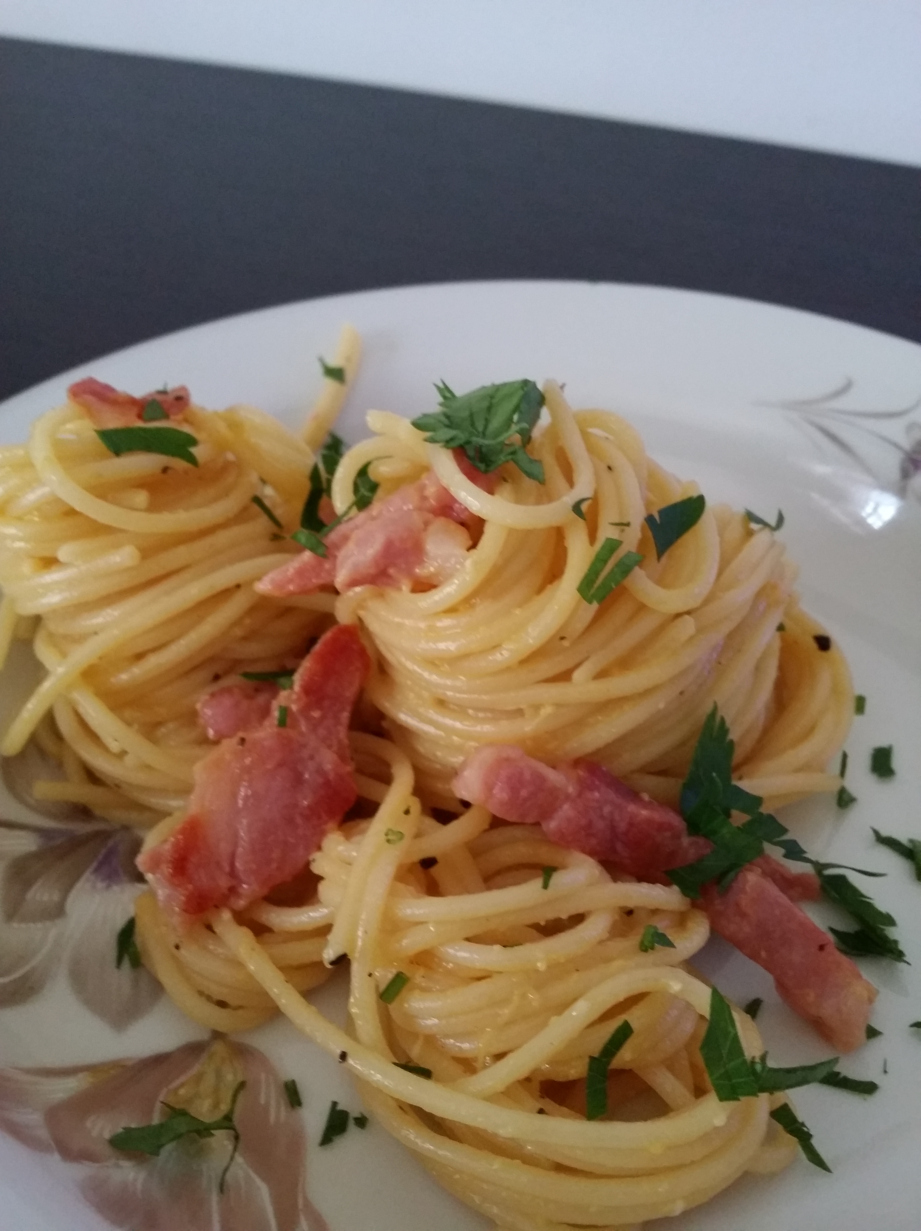 Li riconoscete?, forse no e penso che i puristi si squatreranno contro di me. Si tratta di spaghetti alla carbonare impreziositi da prezzemolo tritato.