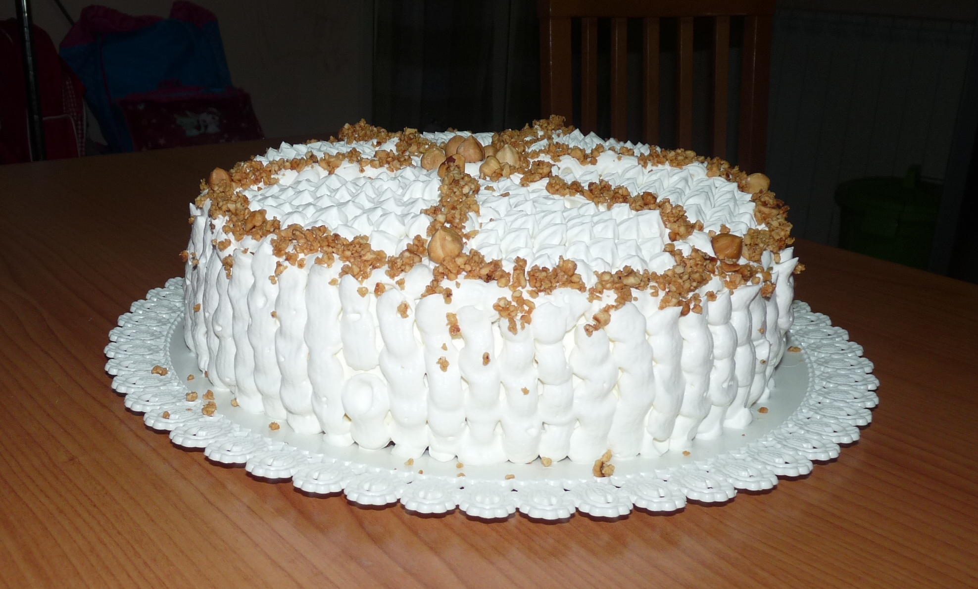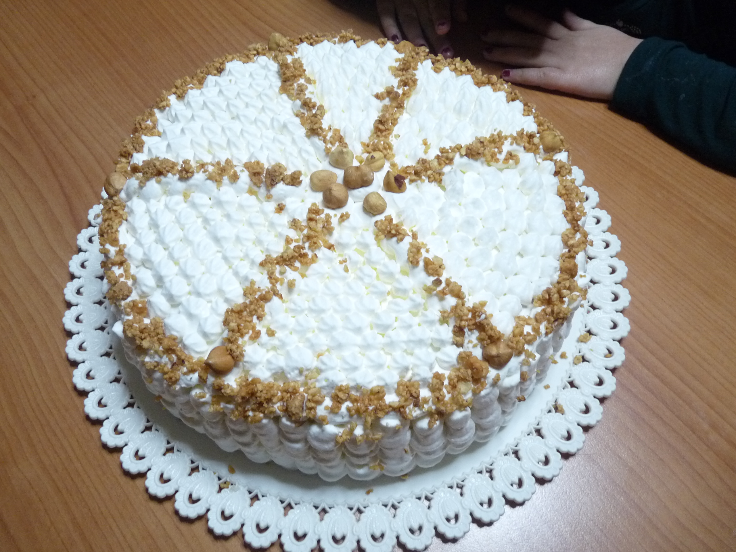 Andiamo all’assemblaggio della torta. Tagliare il pan di Spagna in tre strati, bagnare il primo strato con del latte, versare la crema alle nocciole, coprire con il secondo strato, bagnarlo, versare la crema diplomatica e coprire con l’ultimo strato di pan di Spagna. Decorare quindi con la panna montata e le nocciole.