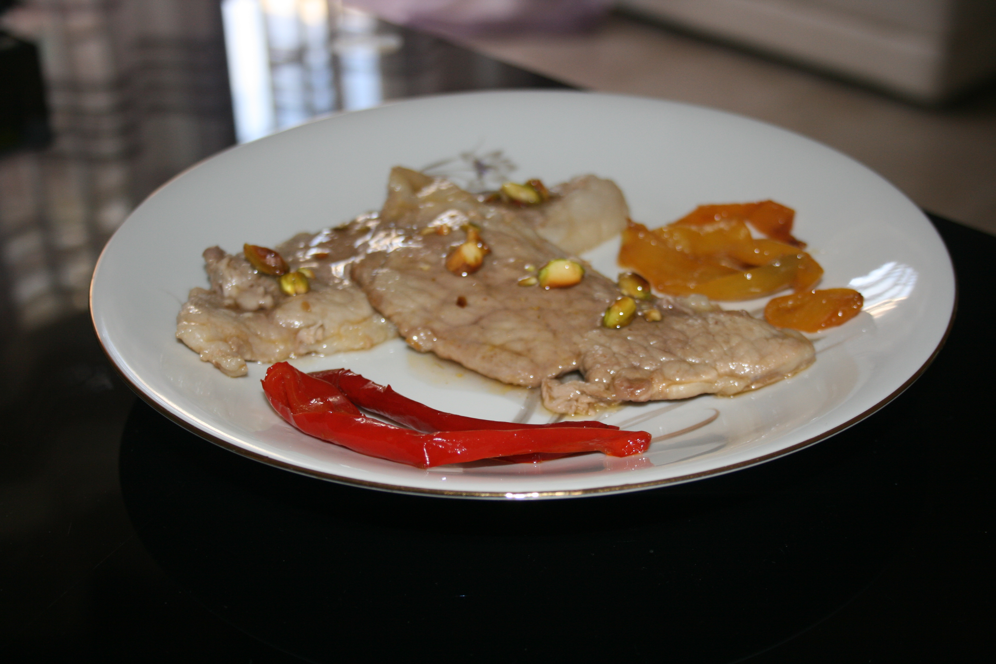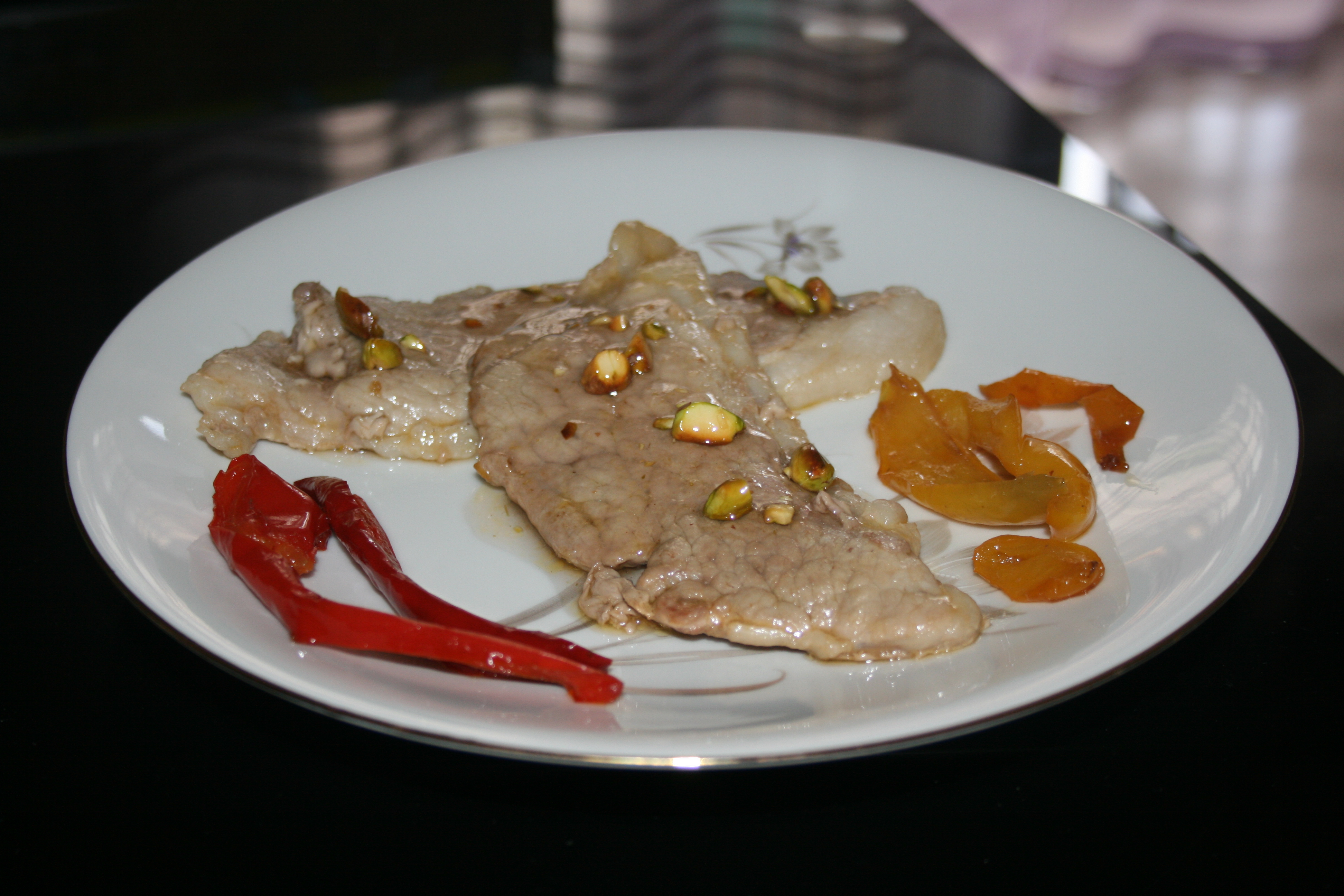 Un piatto su cui metterete i peperoni in un angolo, adagiate due fette di carne, inondate i peperoni con il sughetto della carne e coprire le fette di carne con lo sciroppo di mele e pistacchi.