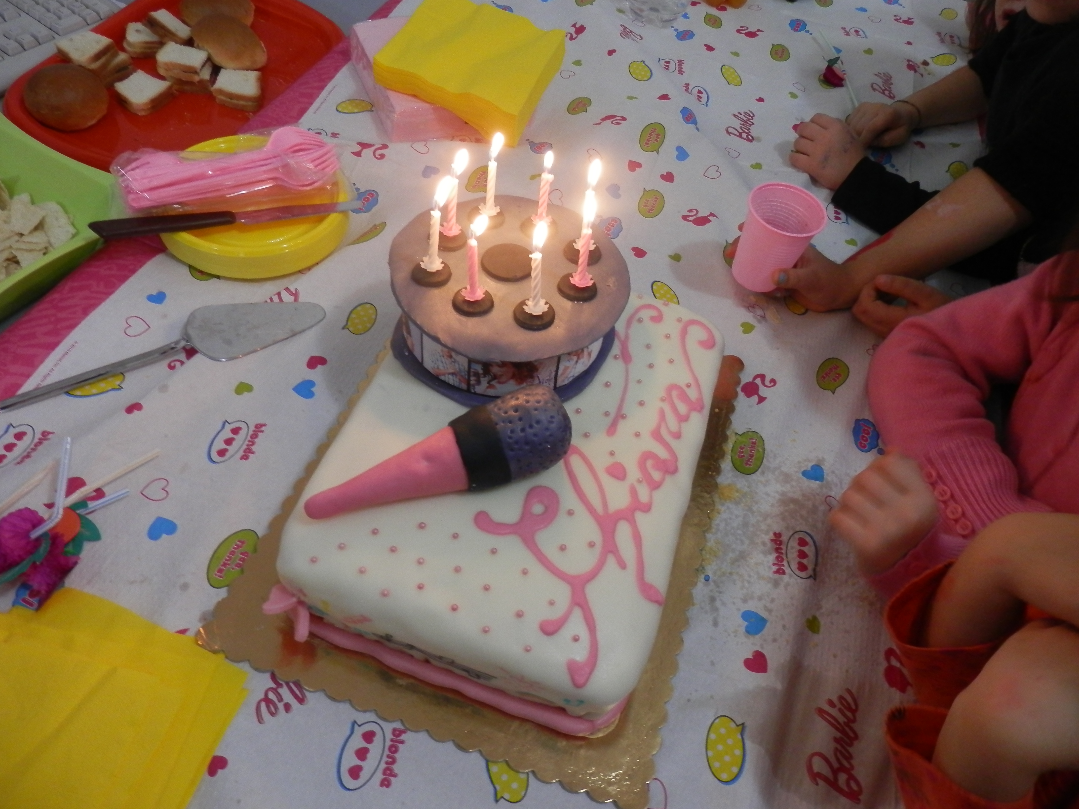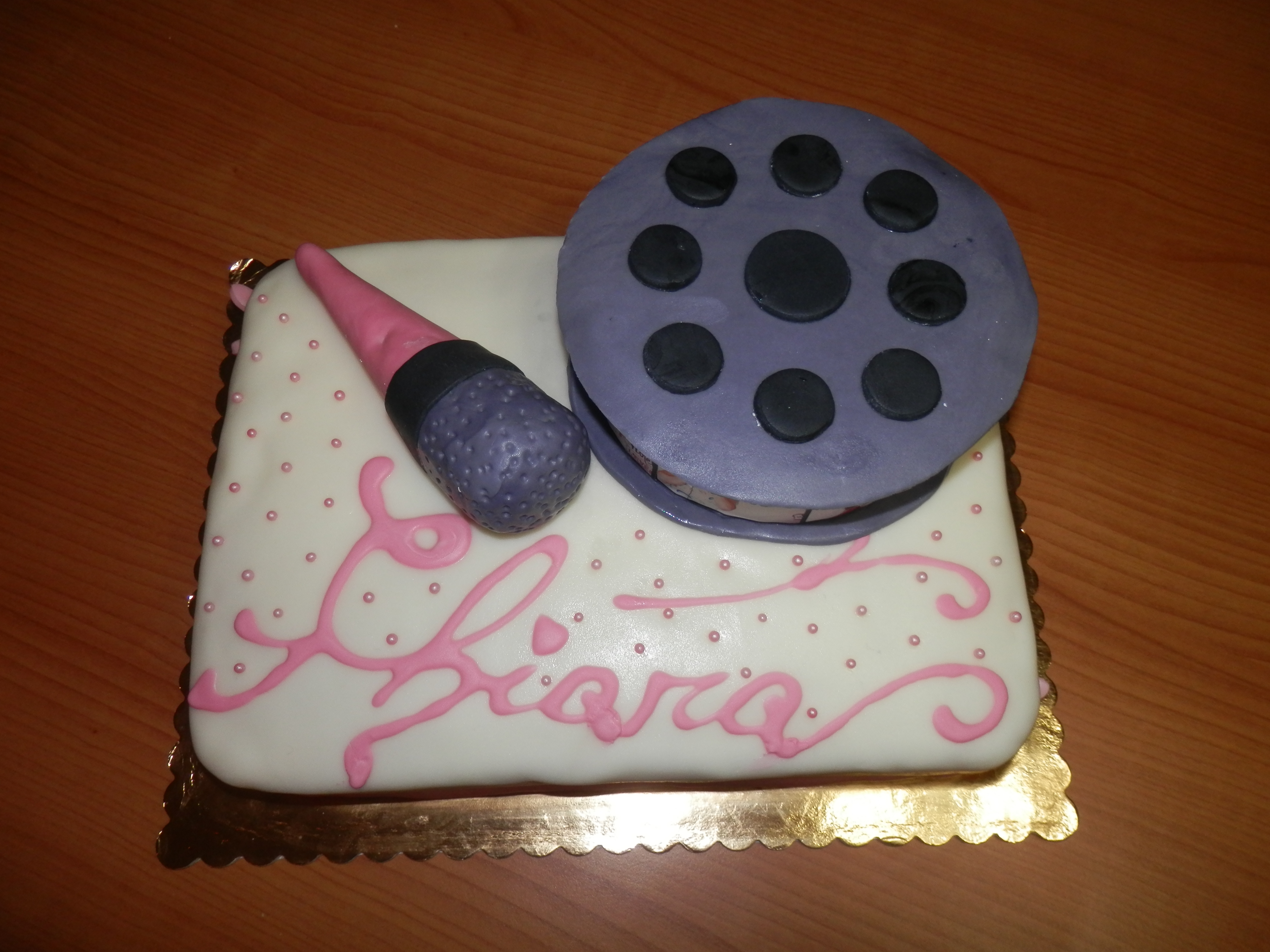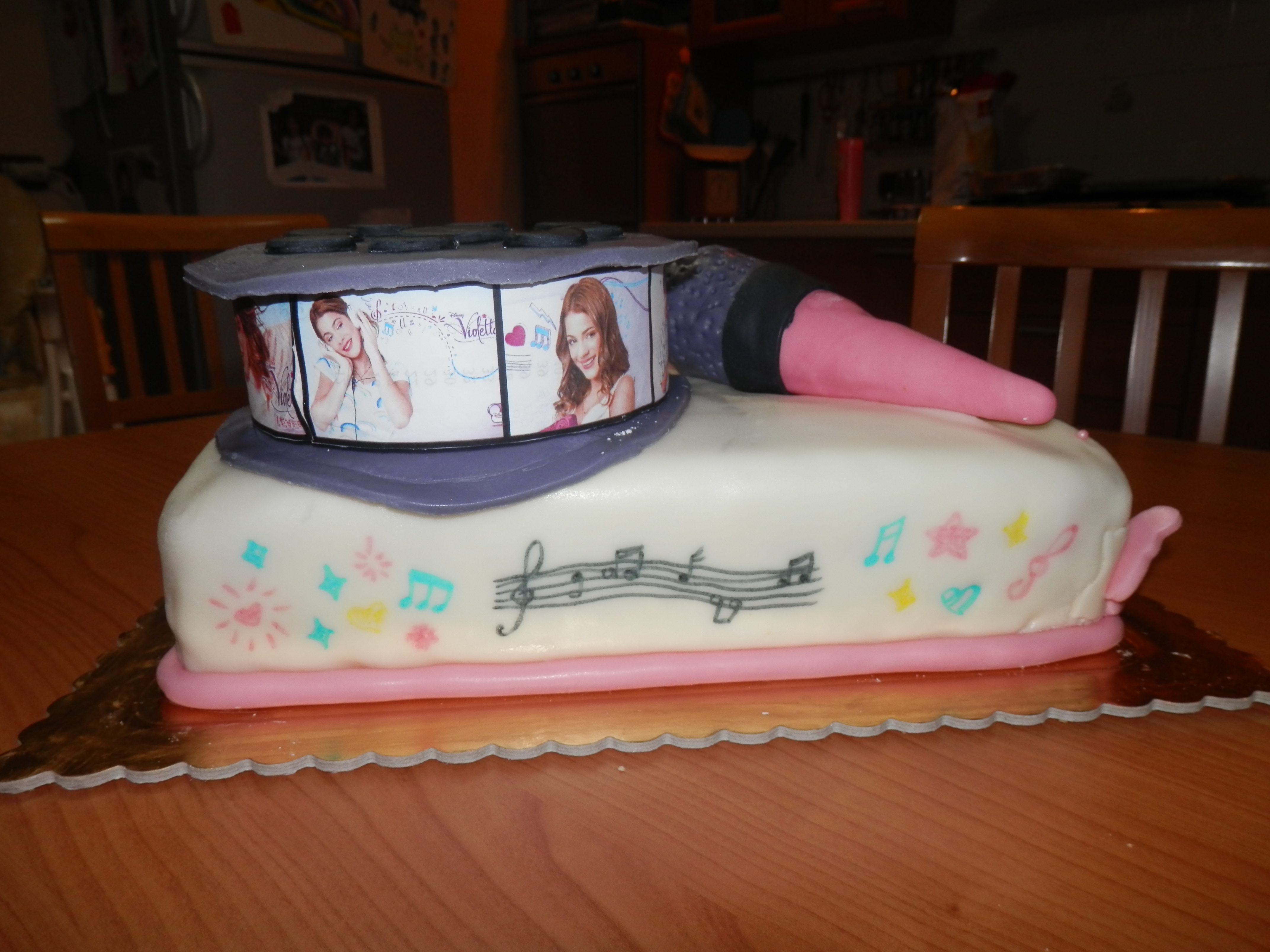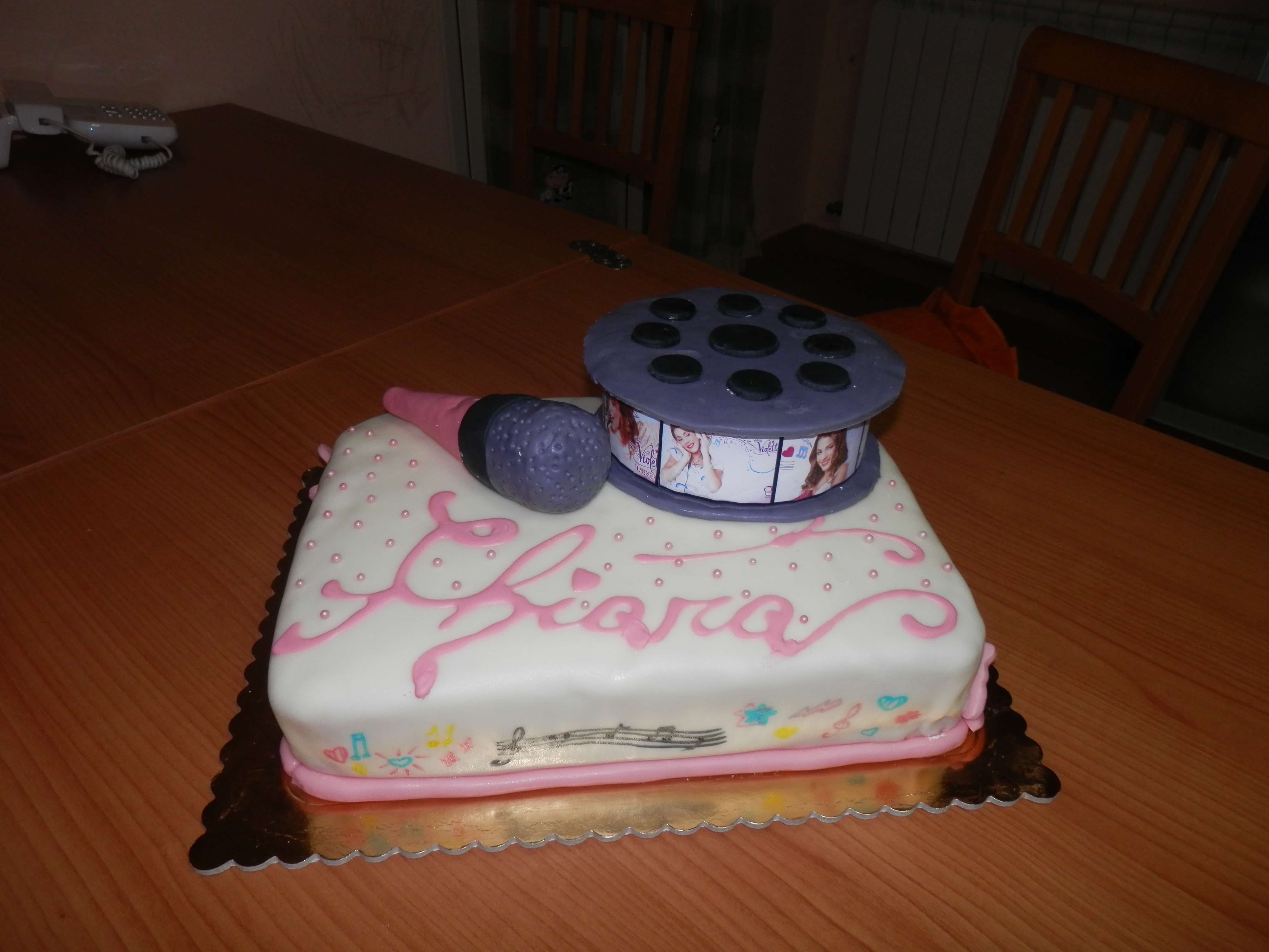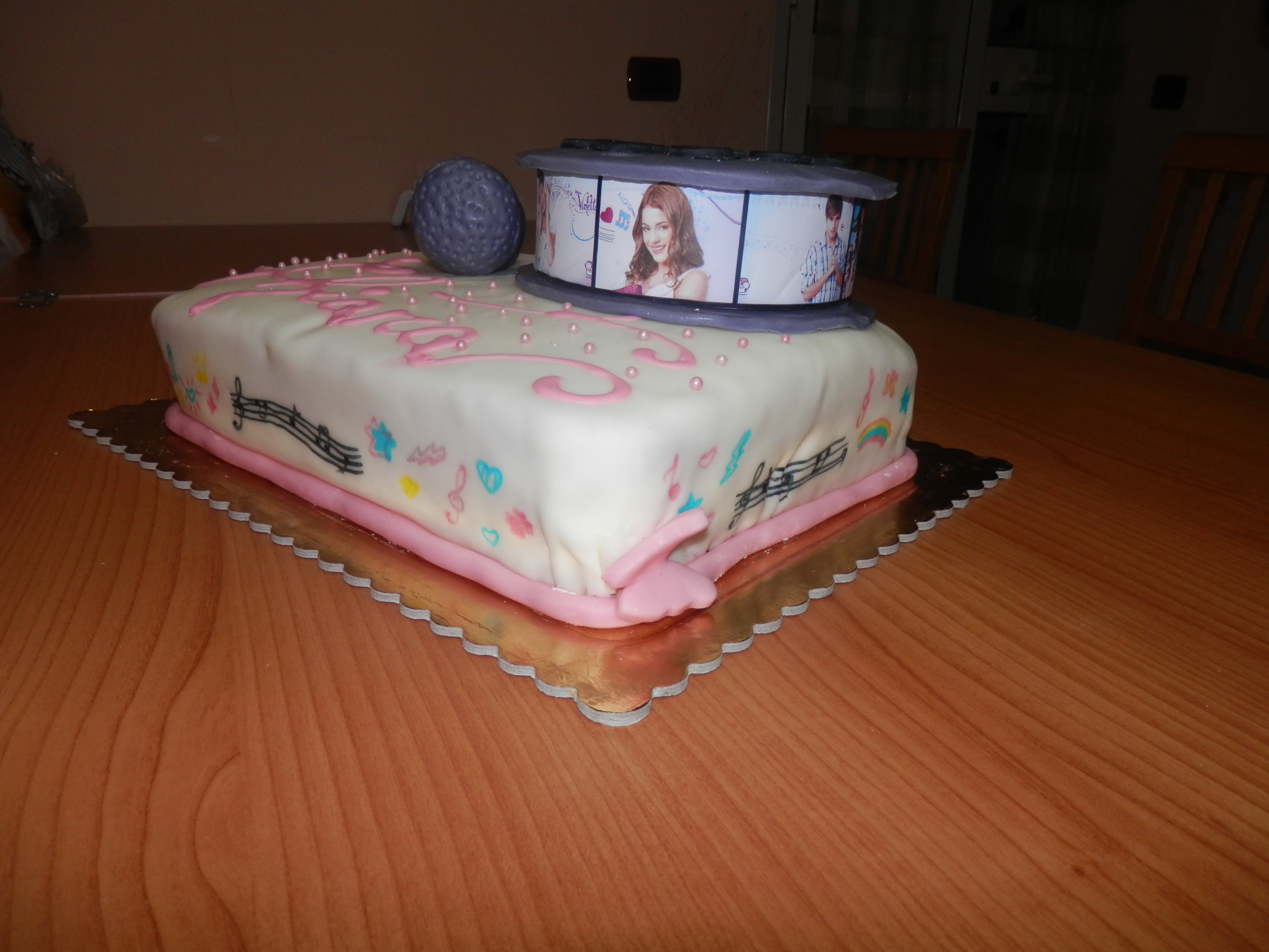 Per quanto riguarda le decorazioni, il microfono, internamente è di carta. La pellicola, invece, è un cilindro di polistirolo e le immagini di Violetta sono state stampate, ritagliate su misura e incollate. Sulla pellicola ho poi messo le candeline, come si può vedere in una foto più avanti.