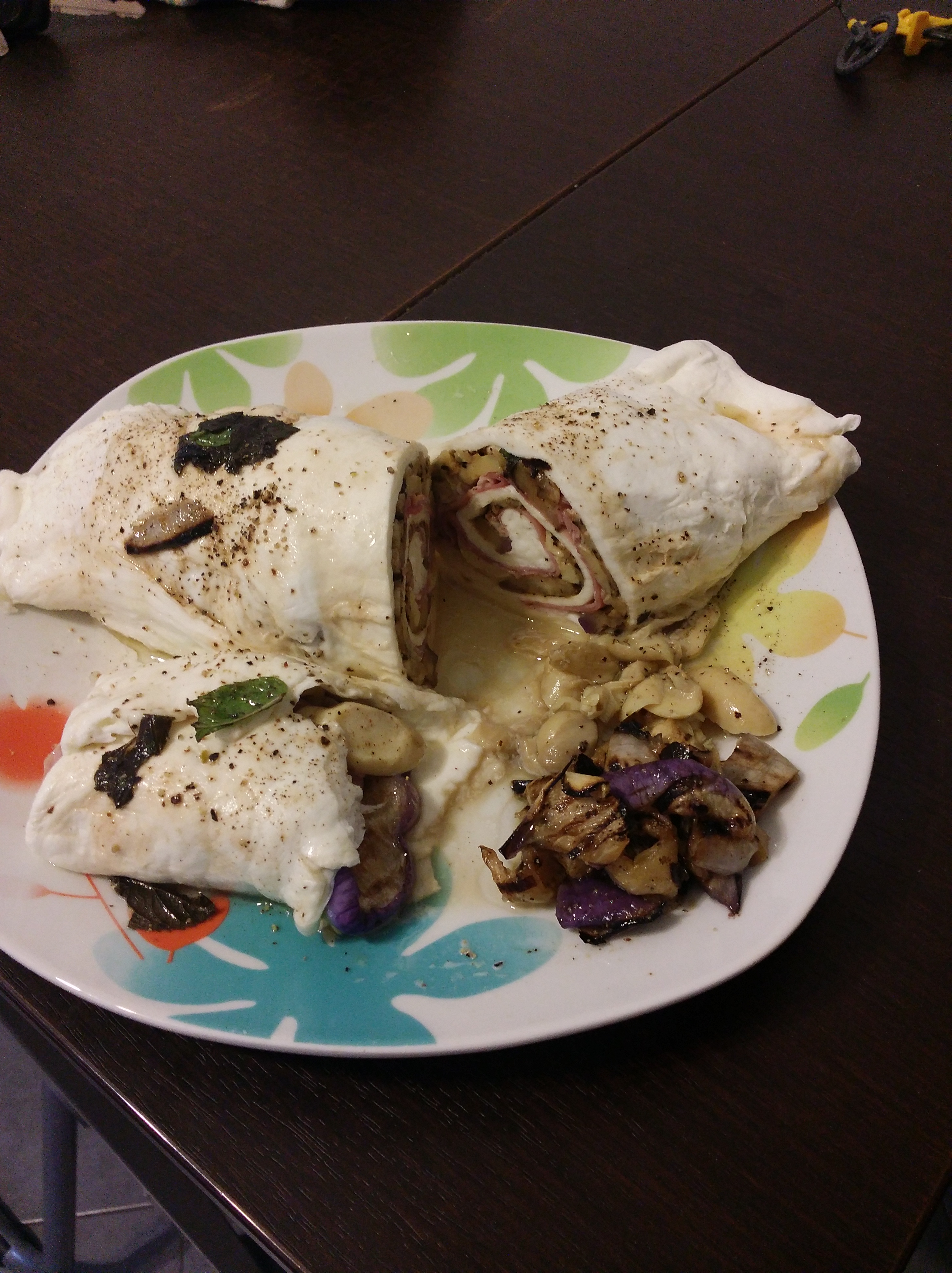 Ed ora, finita la parte complicata facciamo il resto. Su una spianatoia aprite la mozzarella e versate un filo d’olio su di essa spalmandolo ben bene su tutta la superficie. Date anche una spolverata di pepe nero e cominciate ad adagiare sulla mozzarella le fette di melanzane, le fette di prosciutto ed i funghetti.