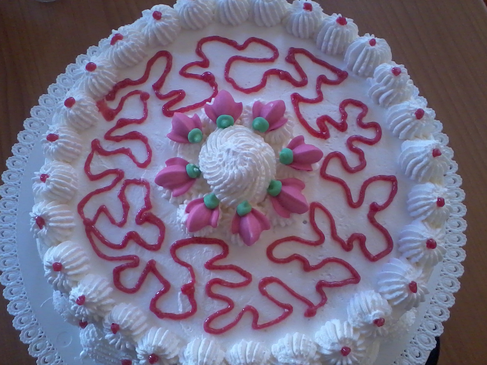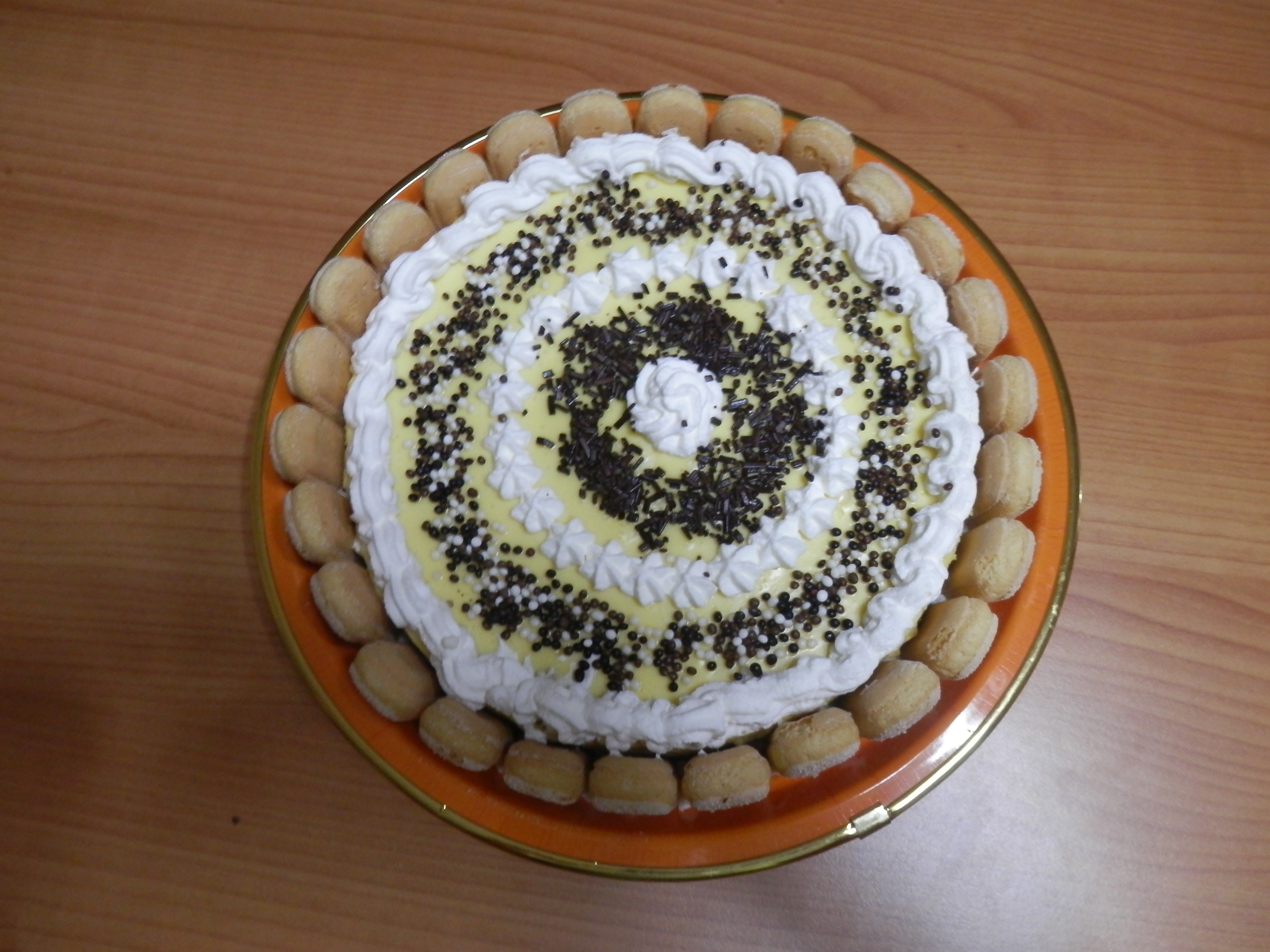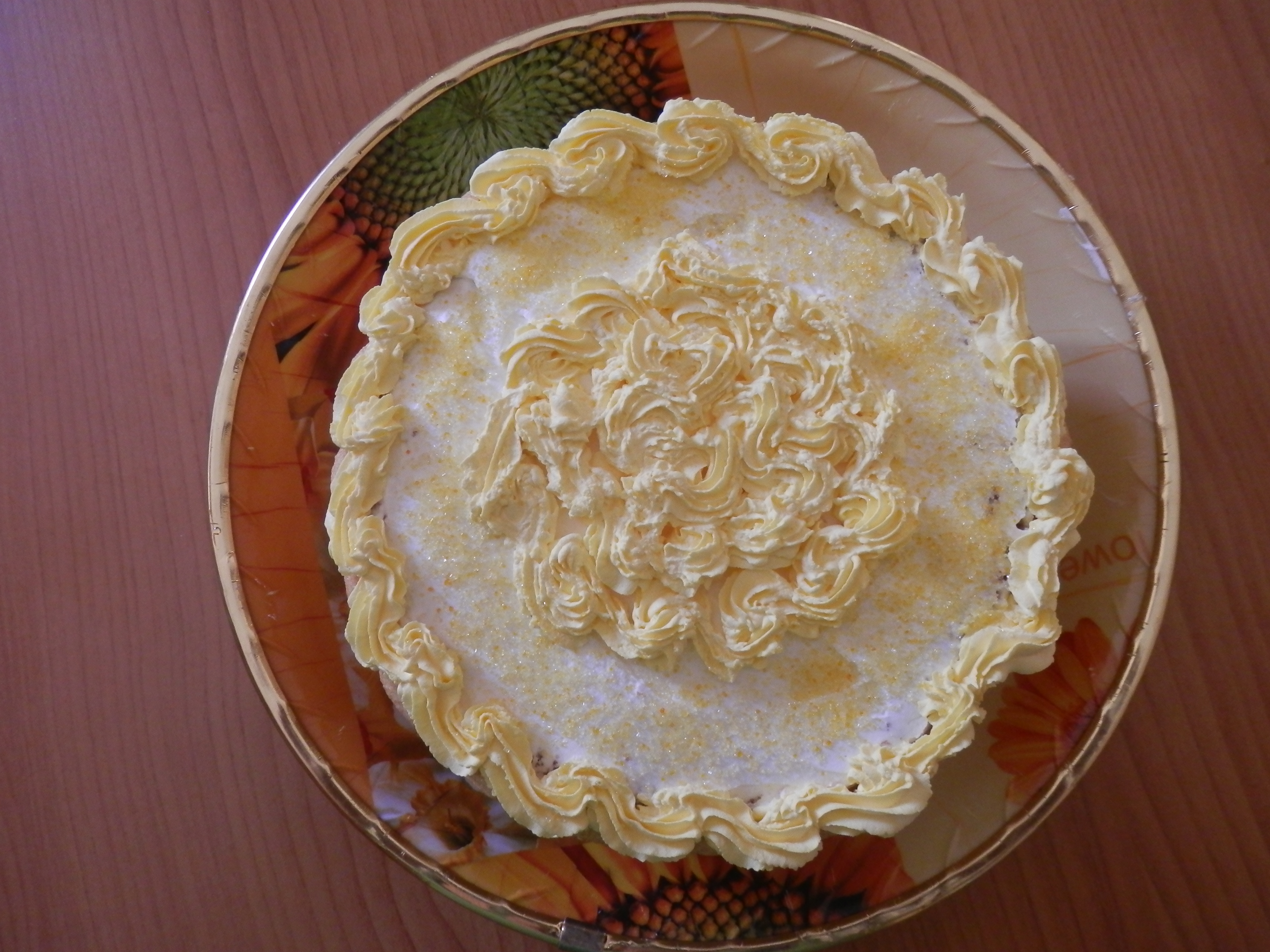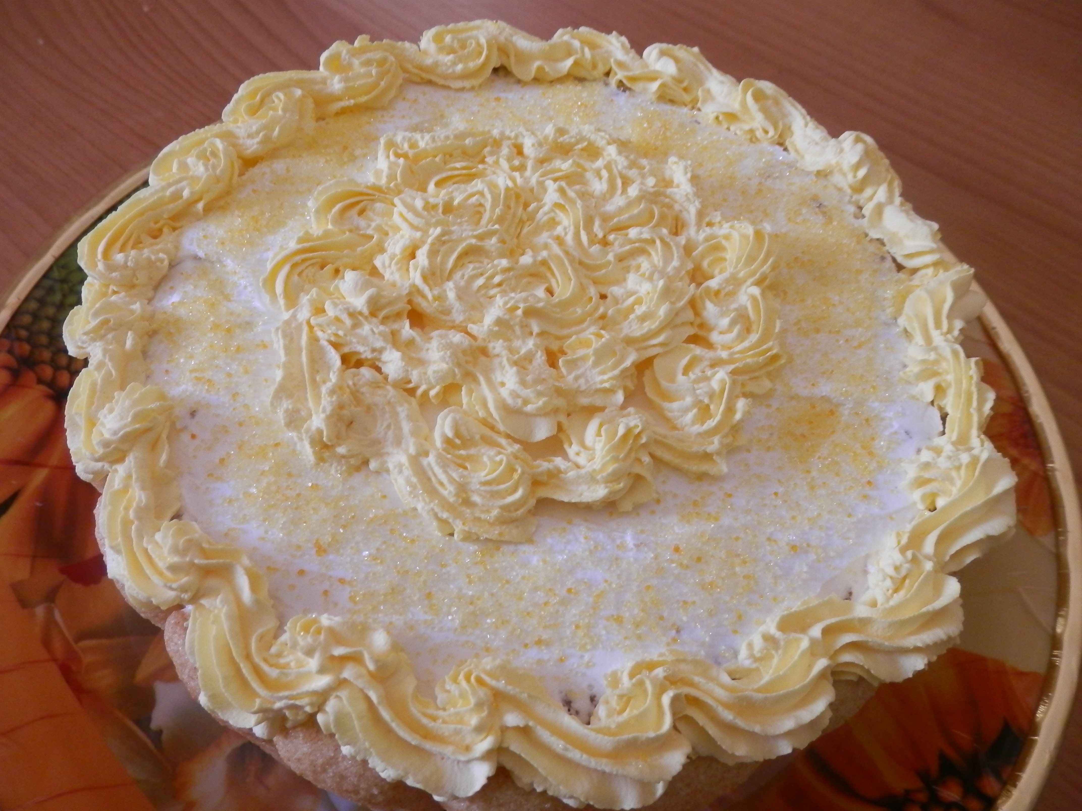 Infine, l’ultima torta: l’ho preparata per lo studio di architettura (non ve l’avevo detto, ma mio marito è architetto) che mio marito gestisce con altri 3 amici. Qui, mi ha dato carta bianca e ho preparato una semplicissima torta con base e farcitura uguali alla seconda torta, ma decorata con panna, che ho lievemente colorato di giallo, e una spolveratina di zucchero colorato (per chi volesse sapere come l’ho preparato, può leggerlo qui: https://leduecucine.com/2015/02/06/torta-per-la-prima-confessione-di-chiara/).
