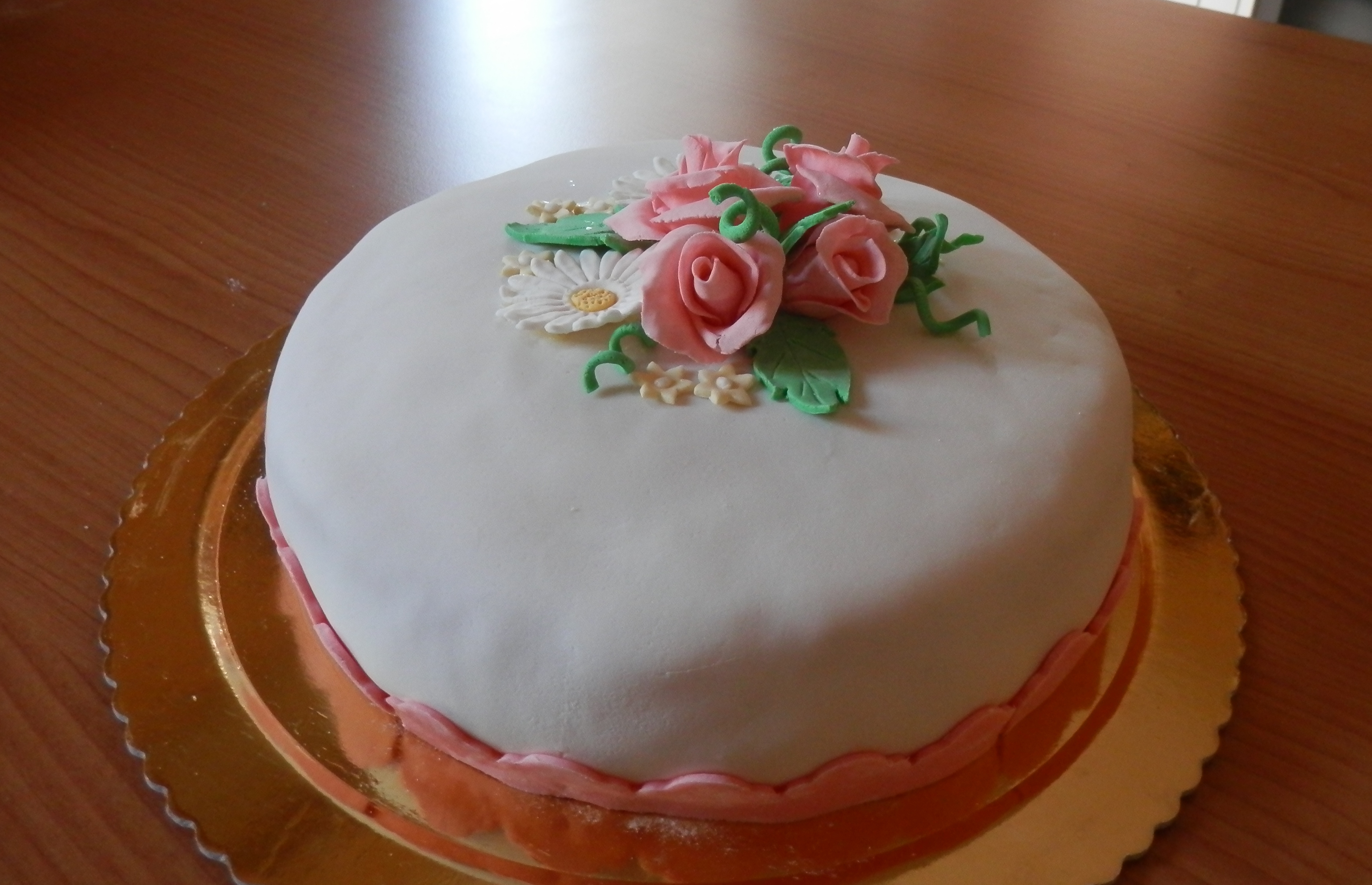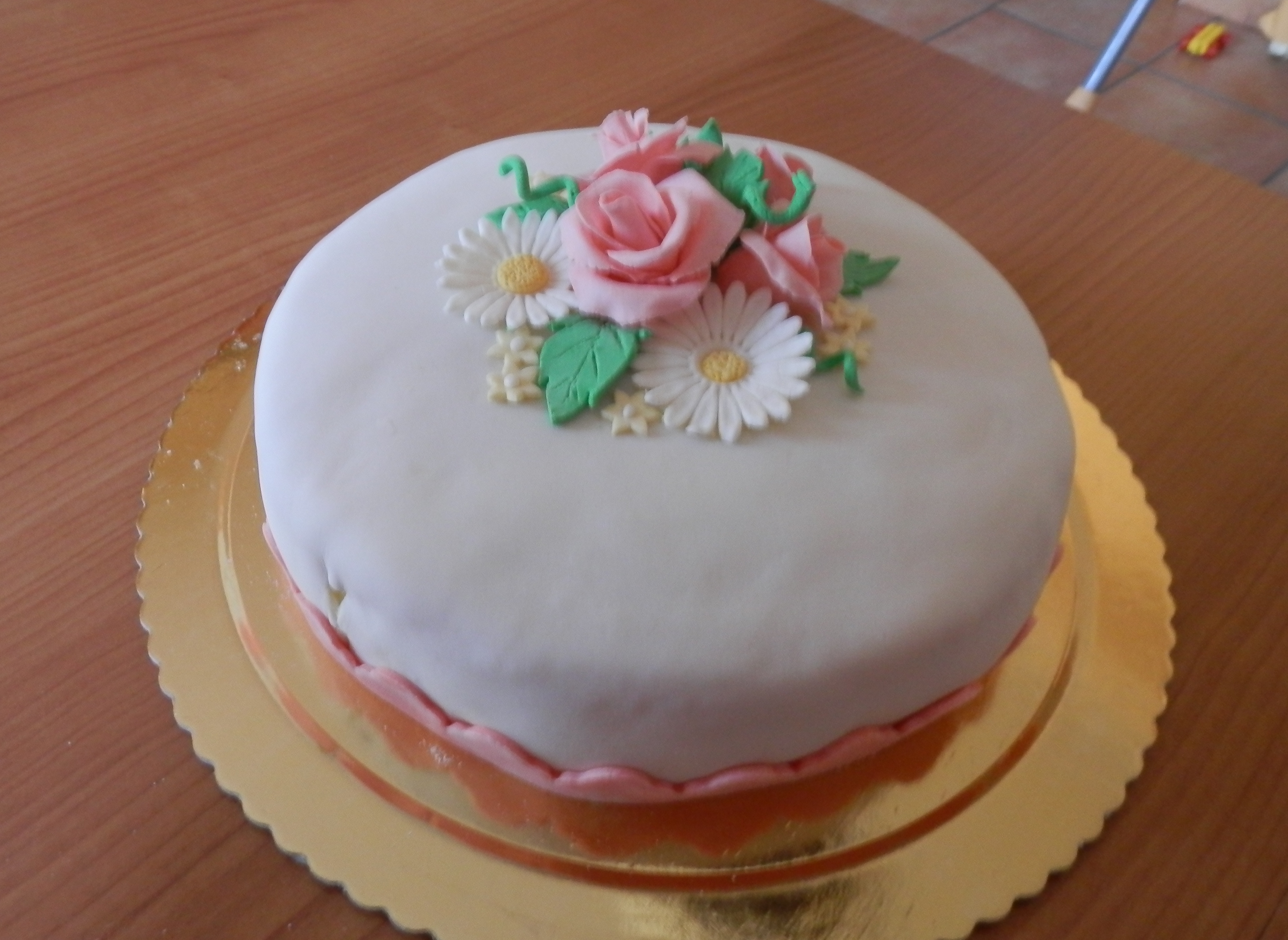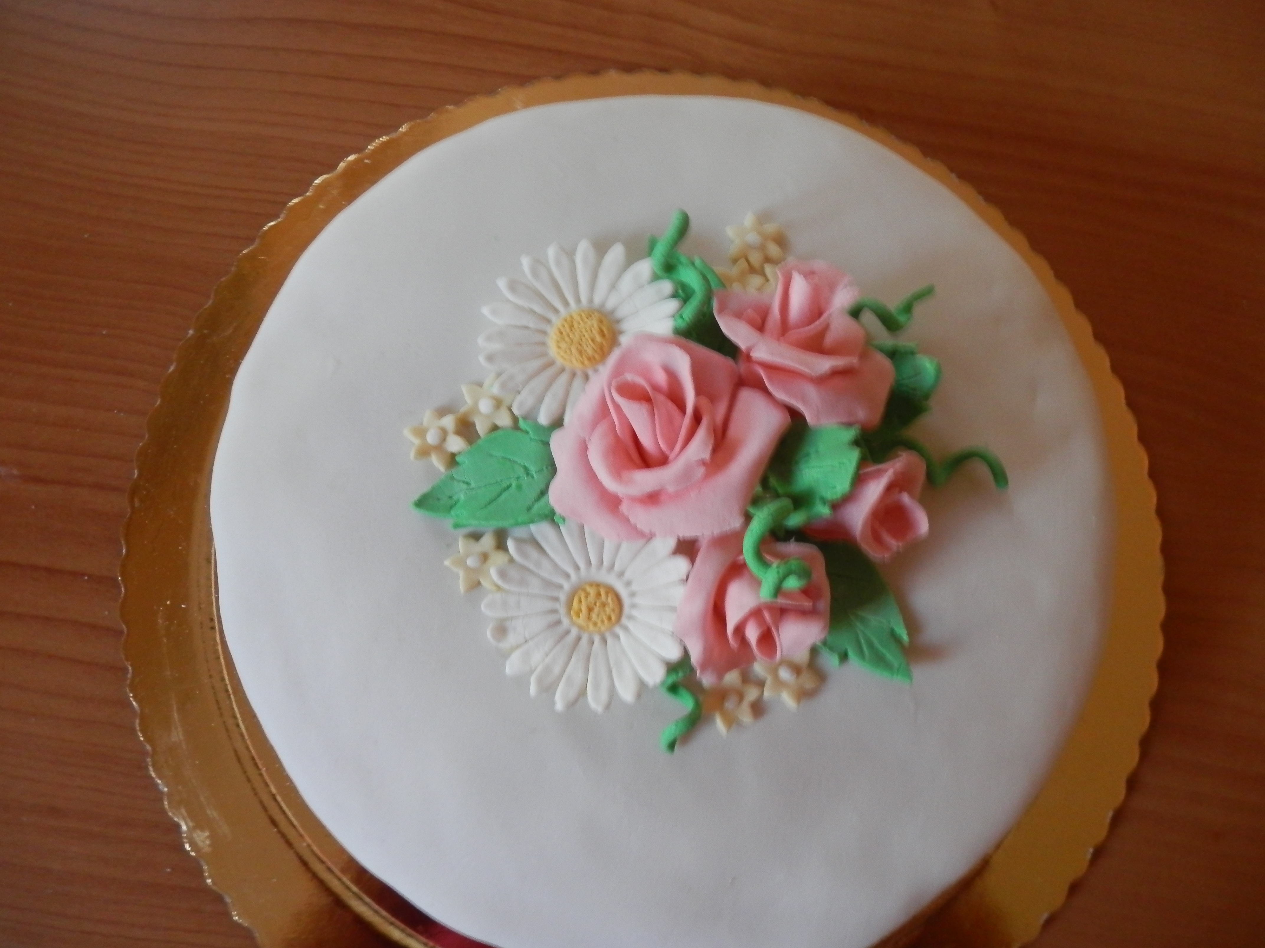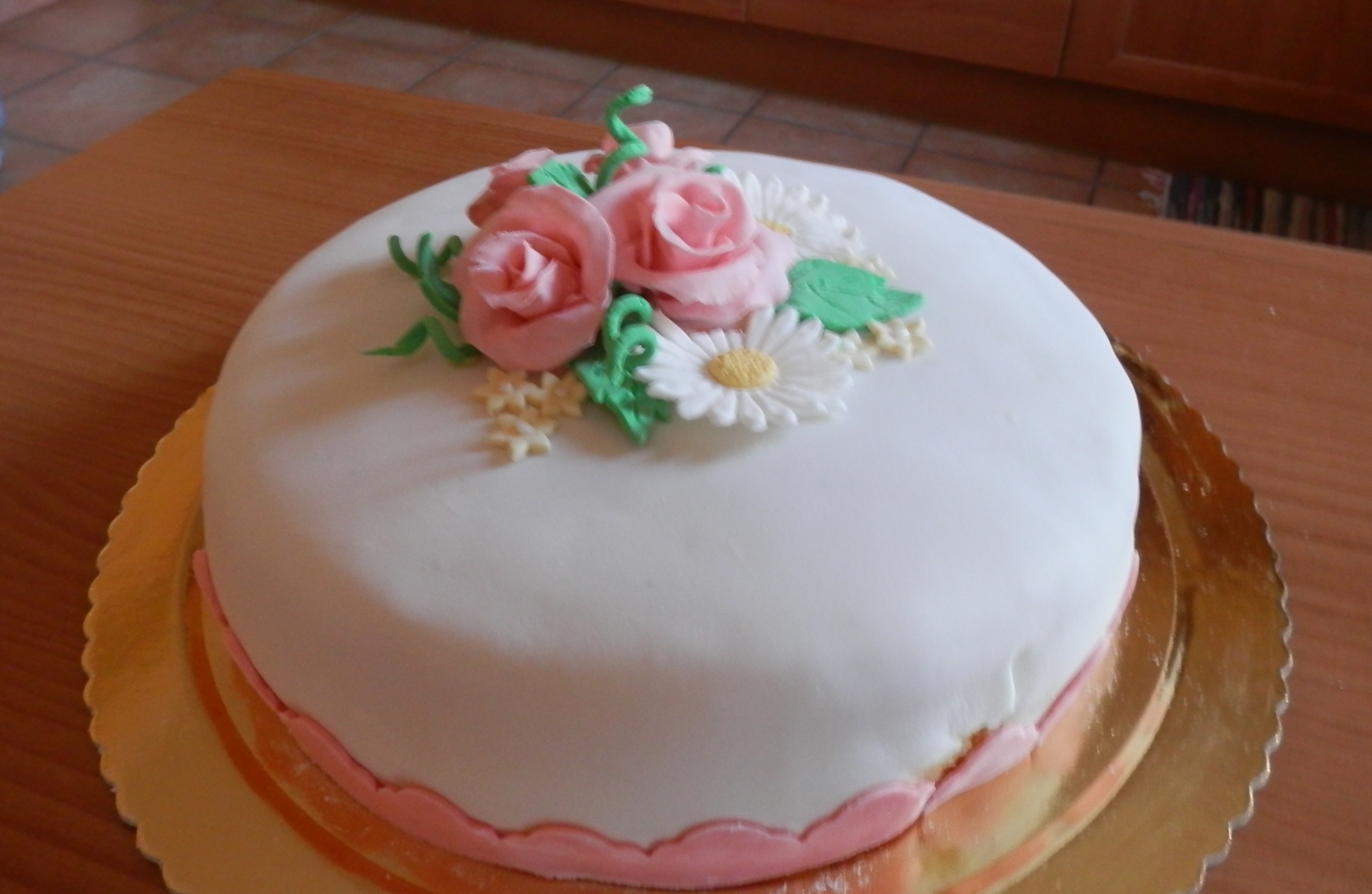 Ci sono molte imperfezioni, soprattutto la torta non è venuta perfettamente liscia come avrebbe dovuto. La decorazione è semplicissima, le margherite e i fiori piccoli li ho fatti con degli stampini, invece le rose le ho fatte io: mi pare che per essere le prime che abbia mai fatto, siano venute bene.