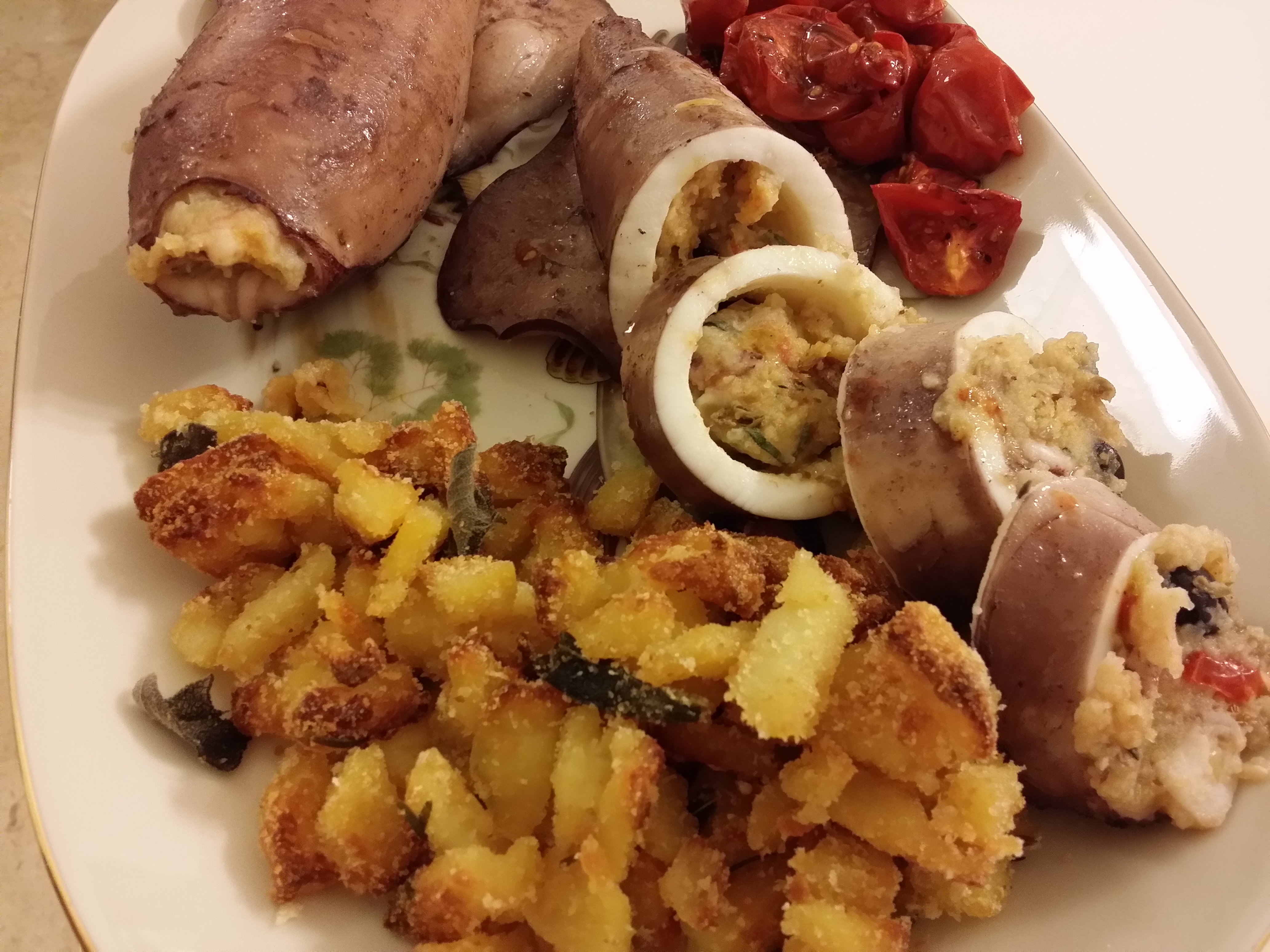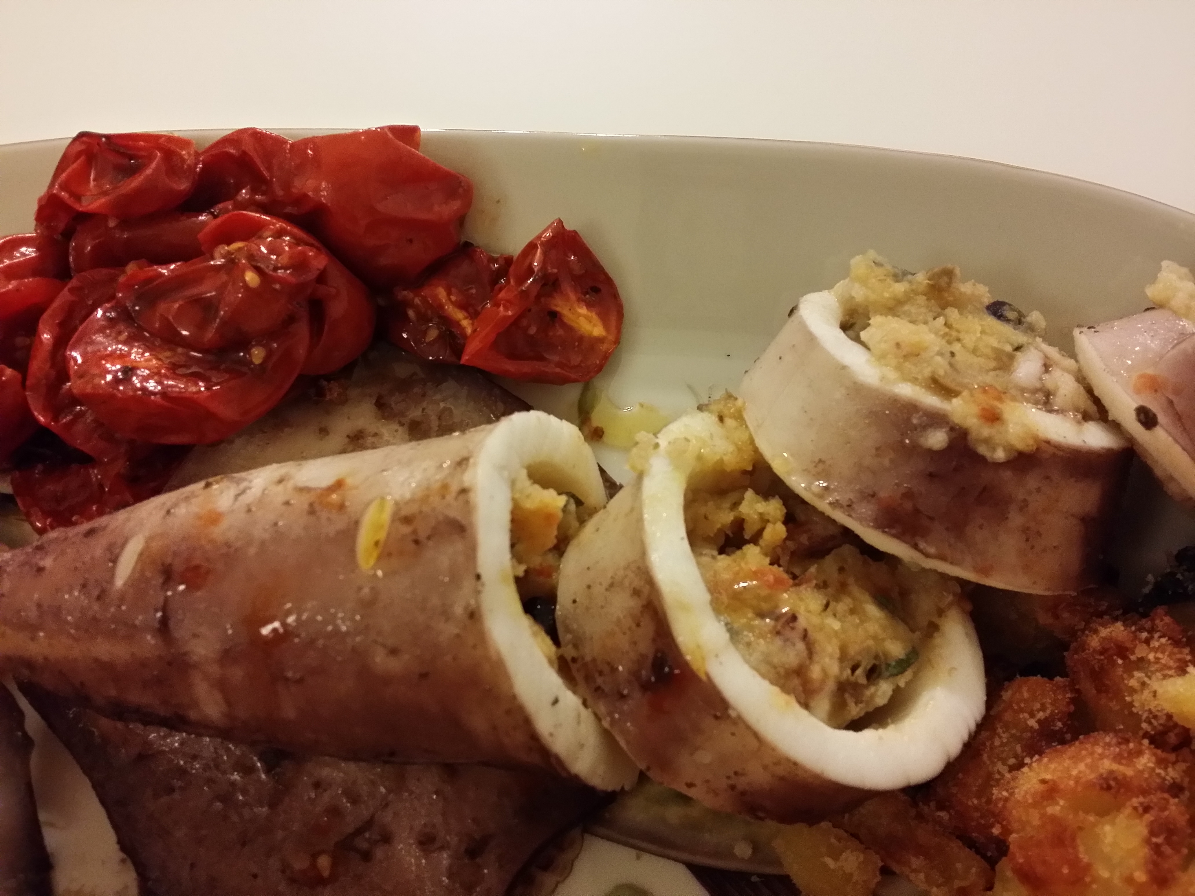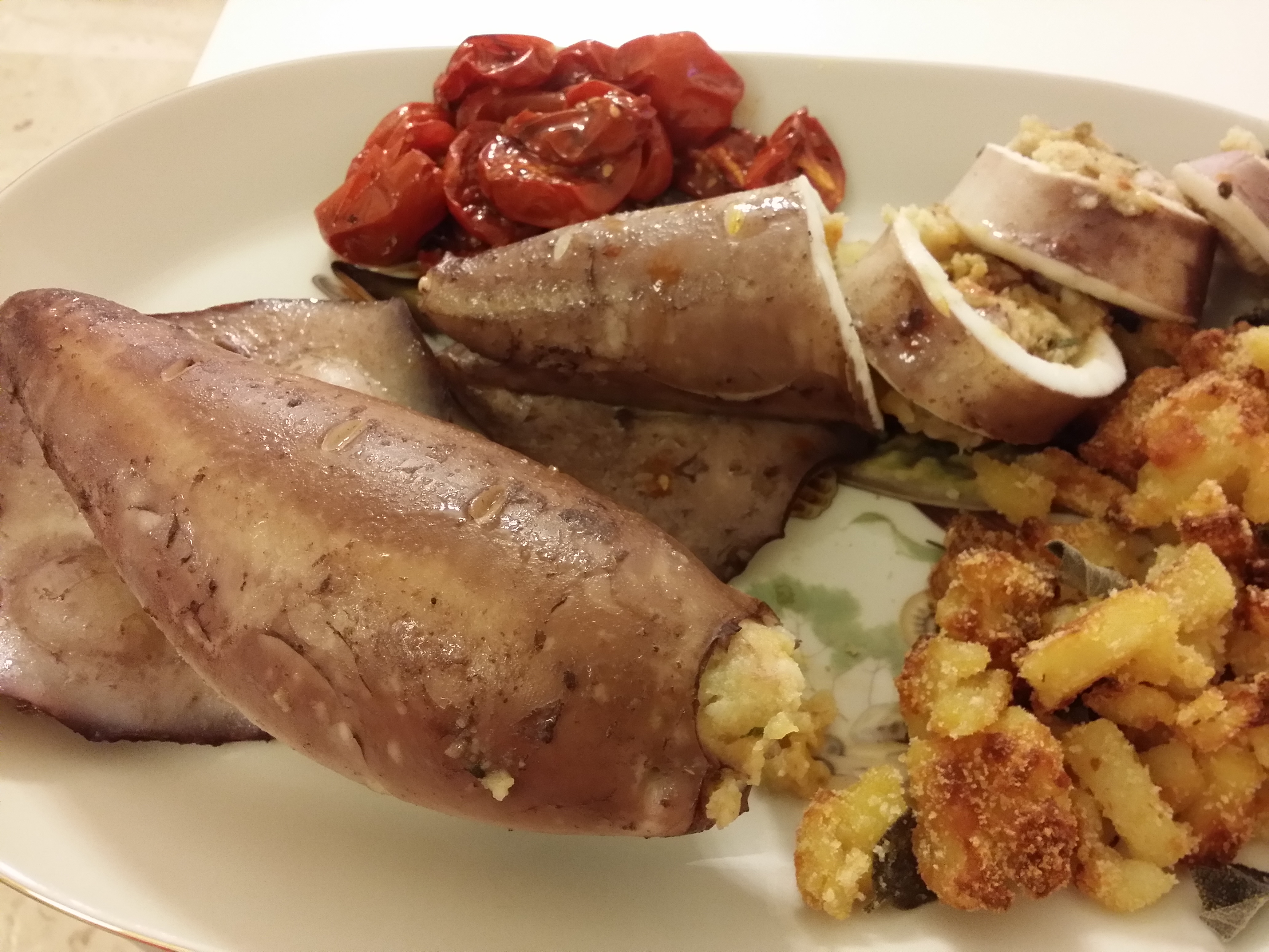 Riempite con il composto ottenuto i due terzi del totano (non eccedete altrimenti in cottura fuoriuscirà tutto), chiudete il totano con degli stecchini e praticate alcune incisioni lungo il corpo con la punta di un coltello.