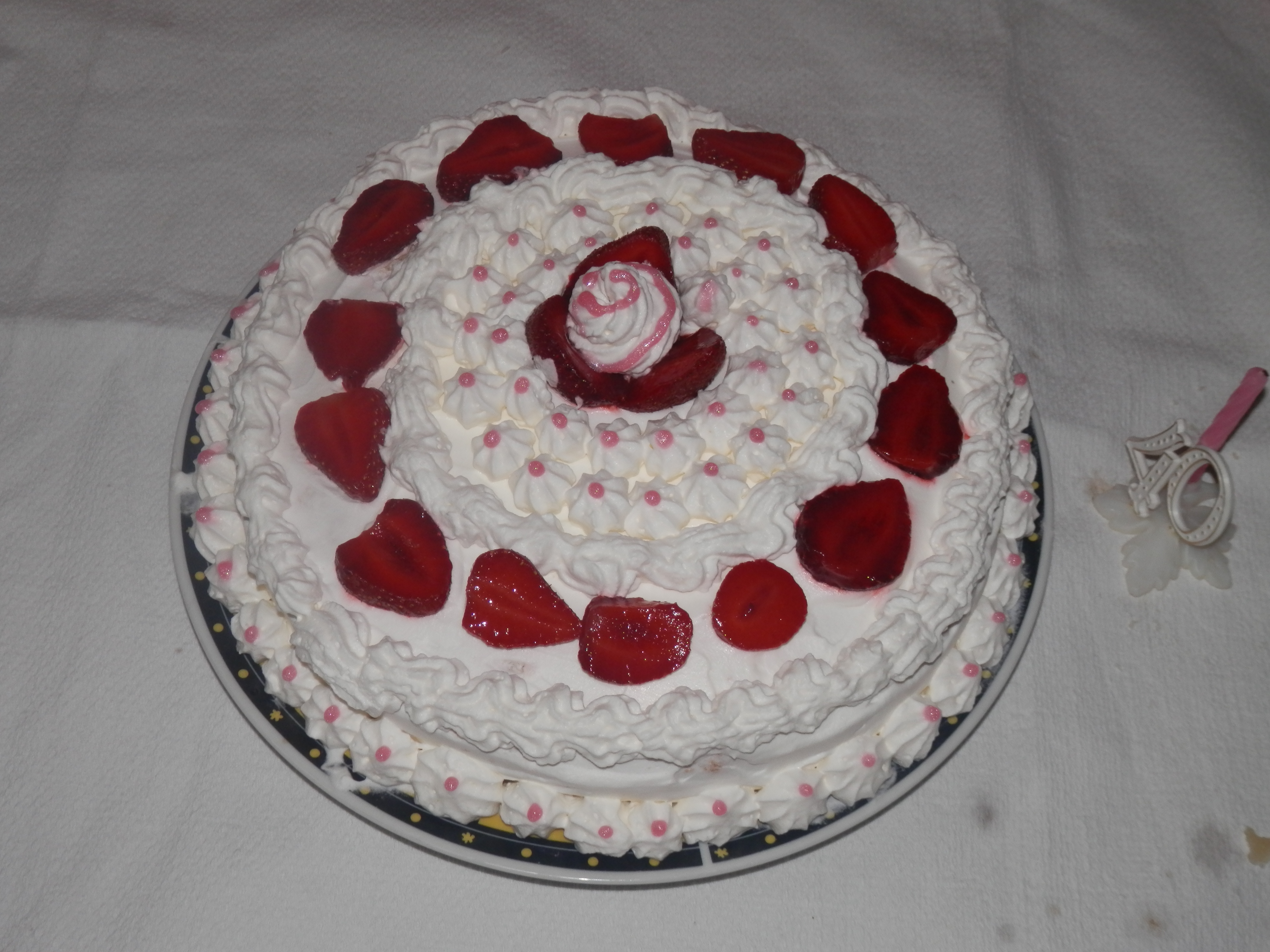 Qui con la decorazione, ho fatto qualche passettino avanti. Solo da un paio d’anni, ho l’abitudine di fotografare le mie torte e solo quelle meglio riuscite: non vi dico quanti pasticci ho combinato, con la sac a poche eravamo acerrime nemiche!!! Mi consolavo con i complimenti che ricevevo per la bontà delle mie torte. Ma, ad un certo punto, questo non mi è bastato più; una volta collaudate le ricette per basi e farciture (anche se continuo a sperimentarne di nuove, soprattutto per quanto riguarda le farce), ho sentito il bisogno di migliorarmi con le tecniche decorative e questa è una delle prime torte “decenti” che ho realizzato.