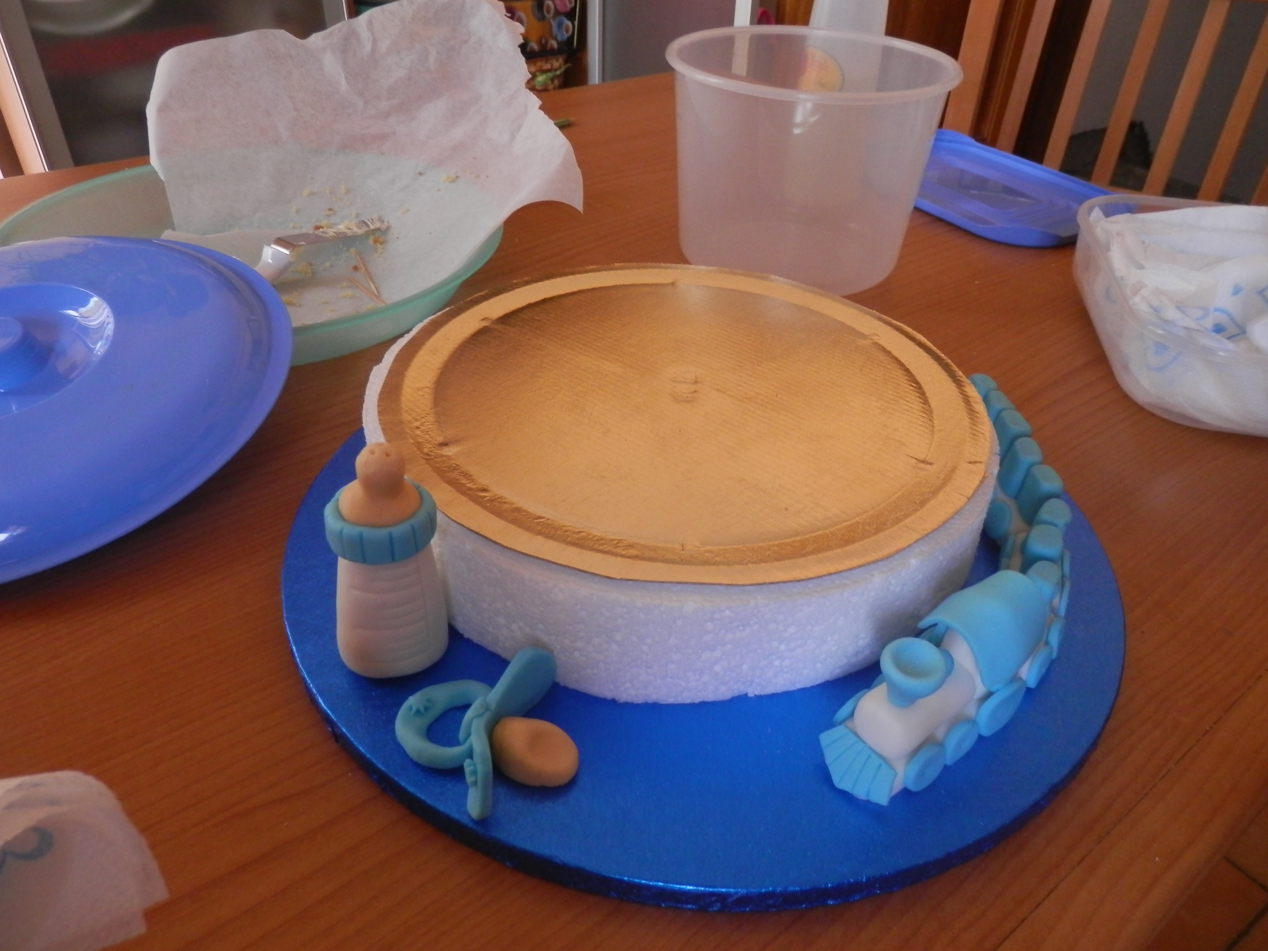 Comunque, non ci ho pensato su più di tanto e mi sono lanciata: ho fatto un po’ di ricerche, ho scelto i soggetti che mi piacevano di più (e che, dettaglio da non sottovalutare, pensavo sarei stata in grado di realizzare) e alla fine, insieme a mia sorella, abbiamo scelto basi e farciture e fatto il progetto della torta: due piani decorati con pochi oggetti infantili, un paio di scarpette, un trenino, un biberon e un ciuccio.