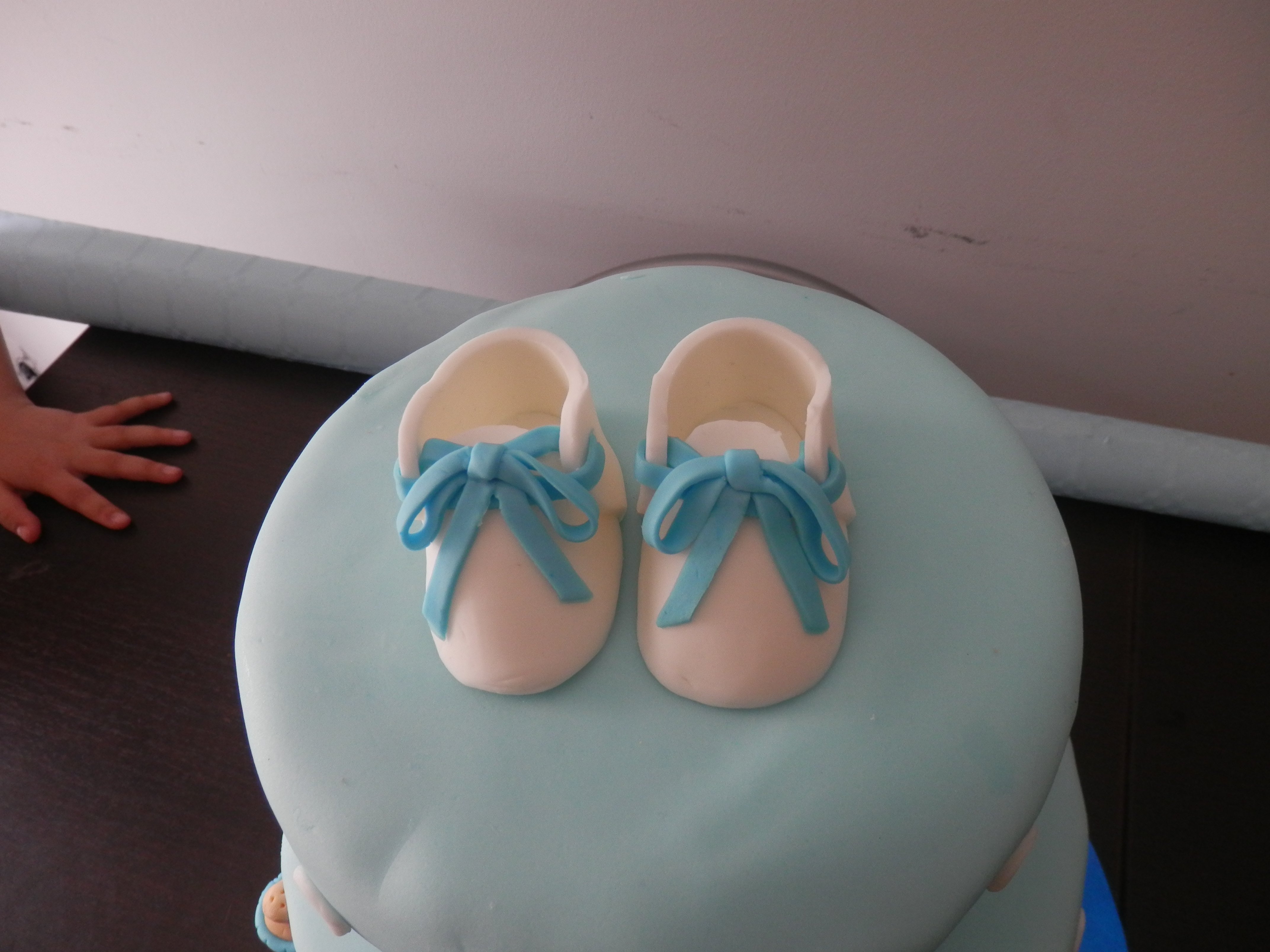 Per fortuna, tutto è andato benissimo: ho comprato tutto l’occorrente e, una settimana prima (dato che i soggetti in pasta di zucchero avrebbero dovuto essere ben asciutti), mi sono messa al lavoro. Ho iniziato dalle scarpine e… quasi subito avrei voluto rinunciare, perché proprio non volevano venire come dicevo io!!! Allora, ho fatto una pausa, mi sono rilassata, ho svuotato la mente e, con estrema calma, ho ricominciato a lavorare: i soggetti sono venuti fuori dalle mie mani come per magia, in modo del tutto naturale (li ho fatti in due giorni). Ci sono delle imperfezioni, ma sono venuti sicuramente meglio di quanto mi aspettassi!!!