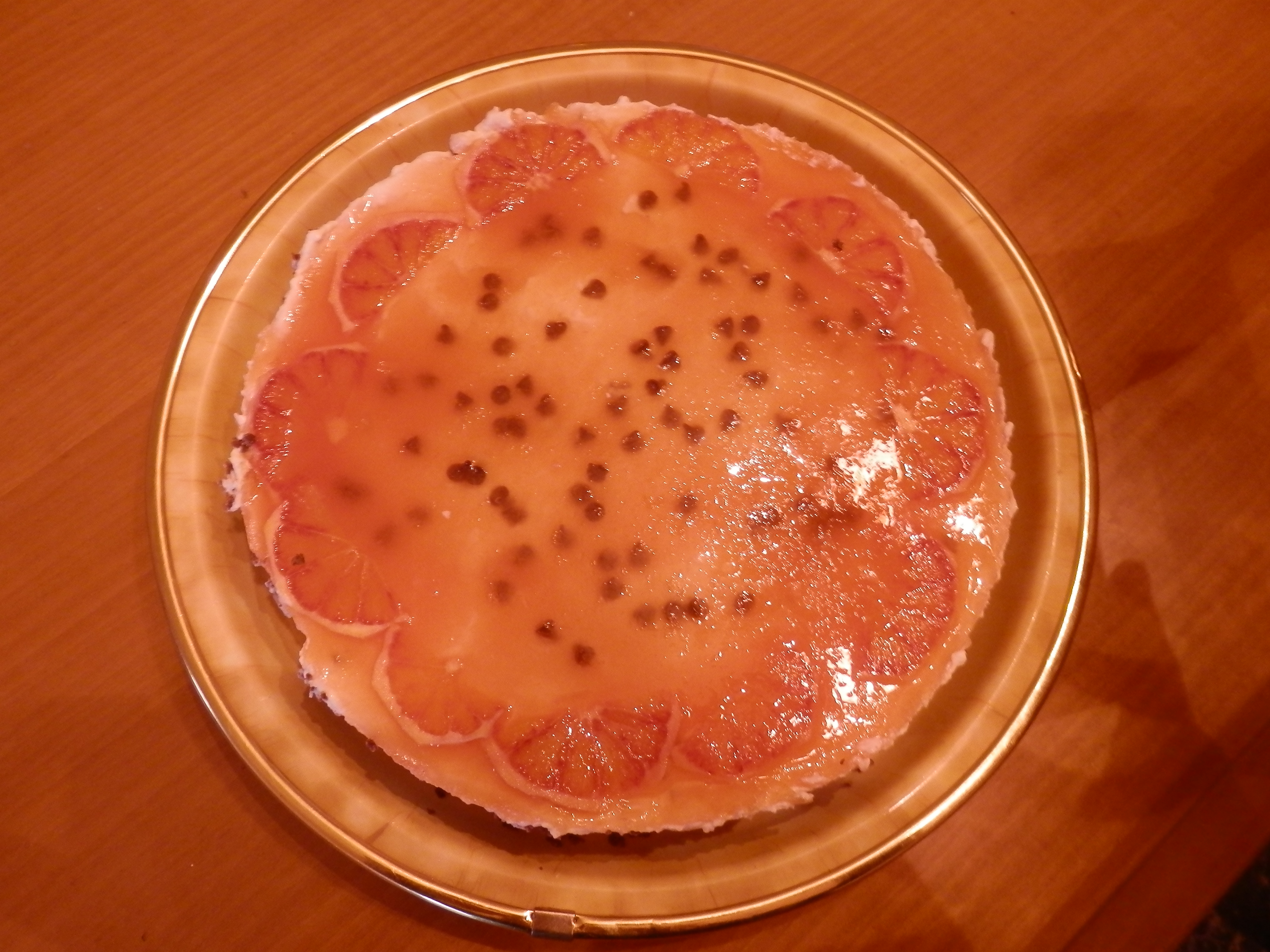 In quella che propongo oggi, la frutta non è presente all’interno, ma solo nel topping, sotto forma di arancia a fette e di gelatina preparata con succo d’arancia fresca. Inoltre ho aggiunto delle gocce di cioccolato fondente sia alla farcia che al topping.