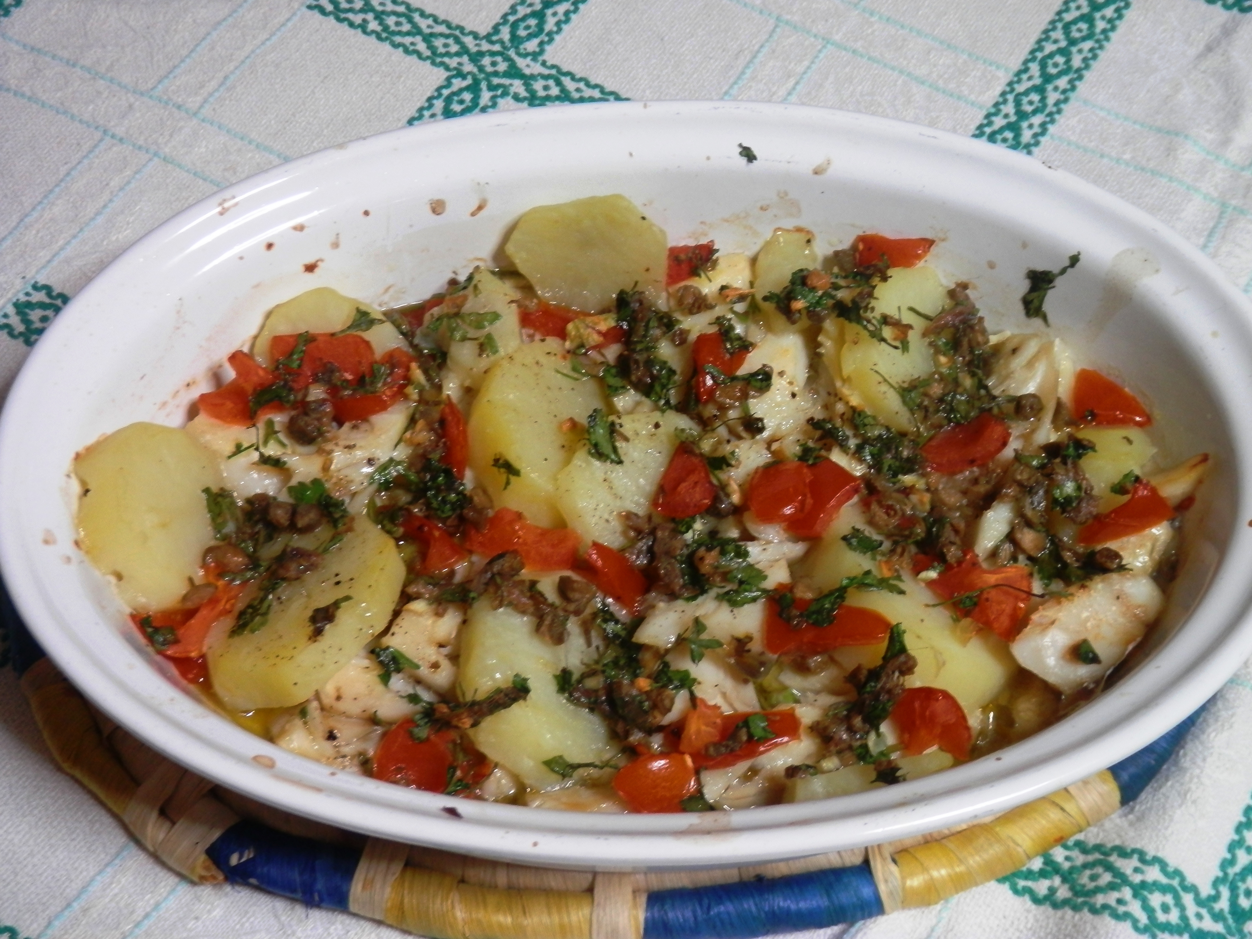 Distribuire, su stoccafisso e patate, il trito e i pomodori, salare (con moderazione, vista la presenza di acciughe e capperi), pepare, versare il vino bianco, irrorare con olio e cuocere in forno già caldo a 180°C per circa 45 minuti (io copro la pirofila con alluminio che poi tolgo negli ultimi 15 minuti di cottura).