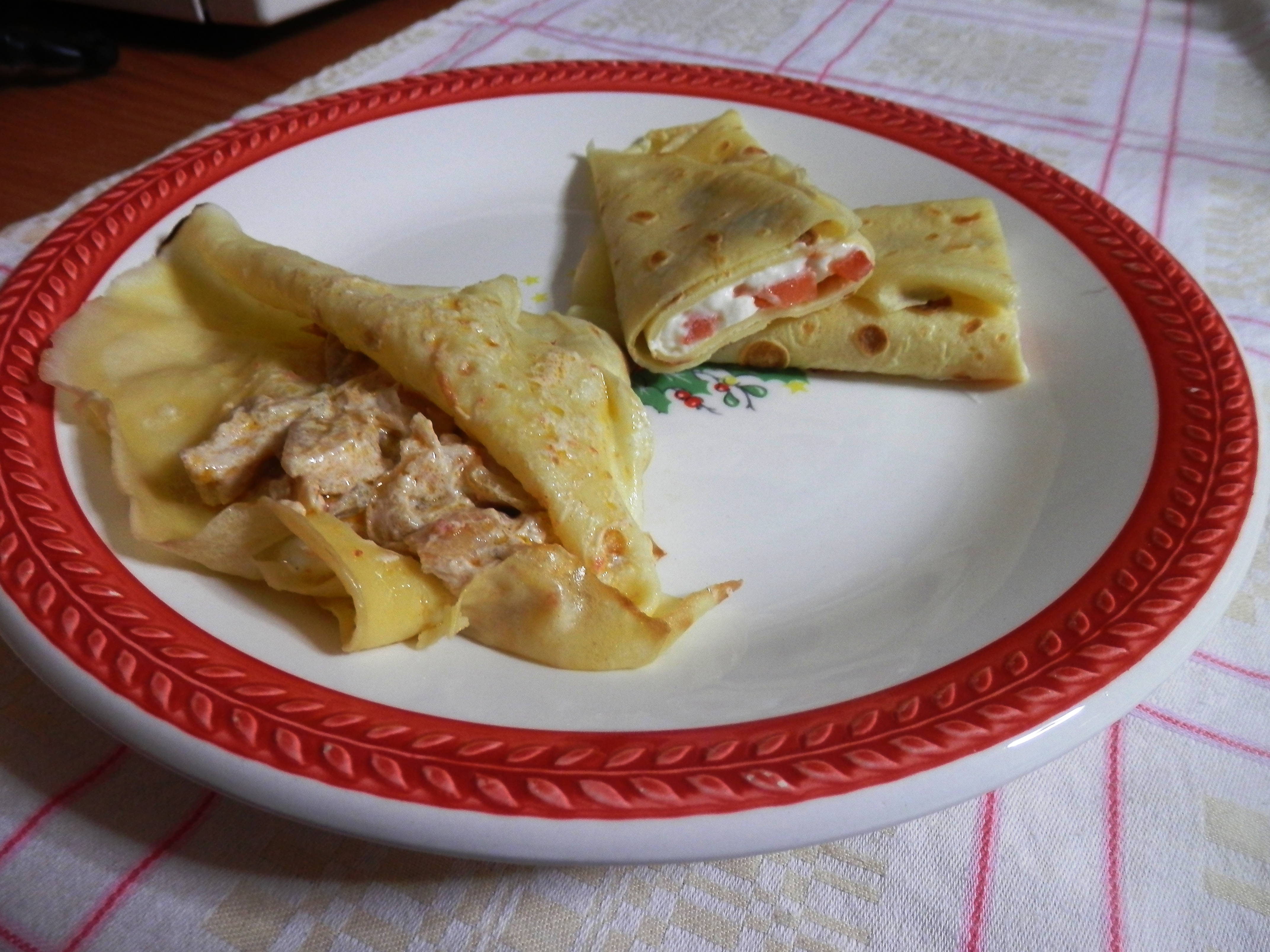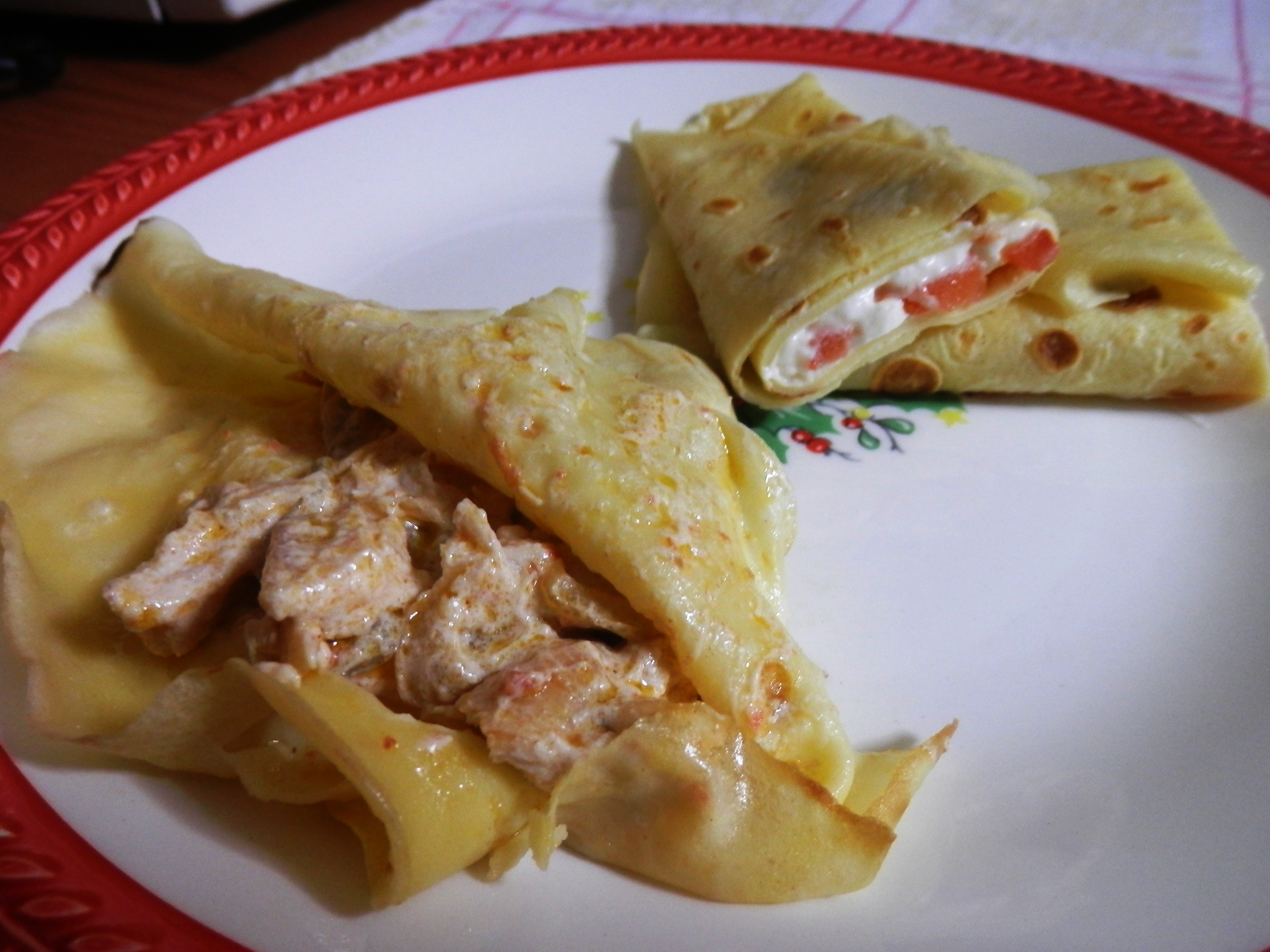 Dopo avervi annoiato (ma spero proprio di no!) con questo racconto, passiamo velocemente alla ricetta che ho trovato in un libriccino che ho visto per caso tempo fa al supermercato (vicino all’ingresso c’è un contenitore con libri, giornaletti, romanzi in edizione tascabile e cose simili. Quando ho tempo, mi metto a cercare e spesso trovo qualcosa di interessante). La ricetta era intitolata “Crespelle all’ungherese”, io non l’ho seguita proprio alla lettera e l’ho ribattezzata “Crêpes con pollo alla paprica”. La ricetta base delle crêpes è quella che uso sempre.